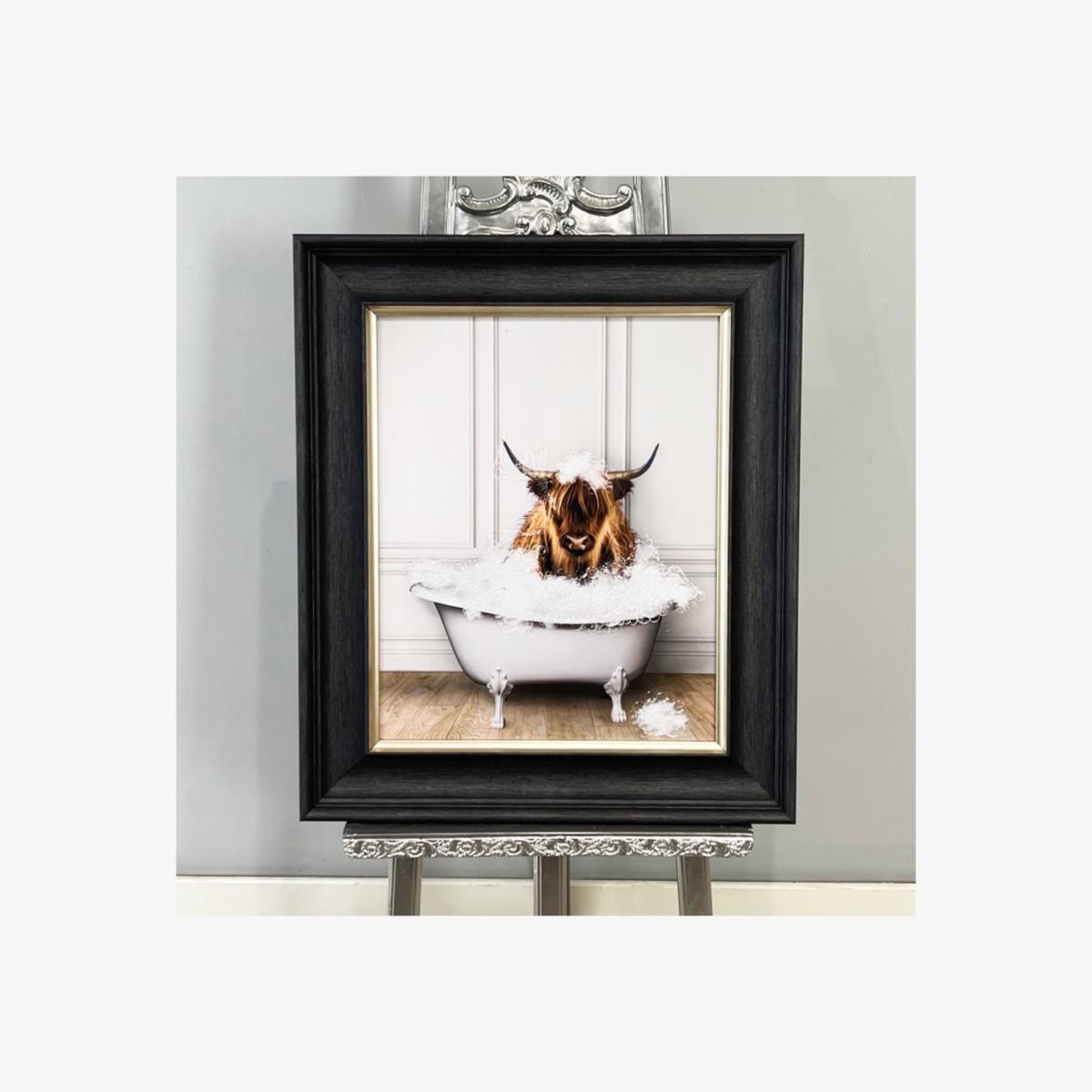 I really like this Highland Cow Tub print as it adds a touch of quirky charm with its playful subject. It works particularly well in eclectic or rustic interiors, where a bit of humour and character can make a space feel more inviting. When styling, consider pairing it with neutral or earthy tones to let the artwork stand out, or combine it with vintage accessories for a cohesive look. For a balanced display, hang it at eye level in living rooms or hallways, and it can even serve as a fun focal point above a sideboard or sofa. Its sizeable frame makes it a great statement piece, so keep surrounding decor simple to let the art do the talking.
