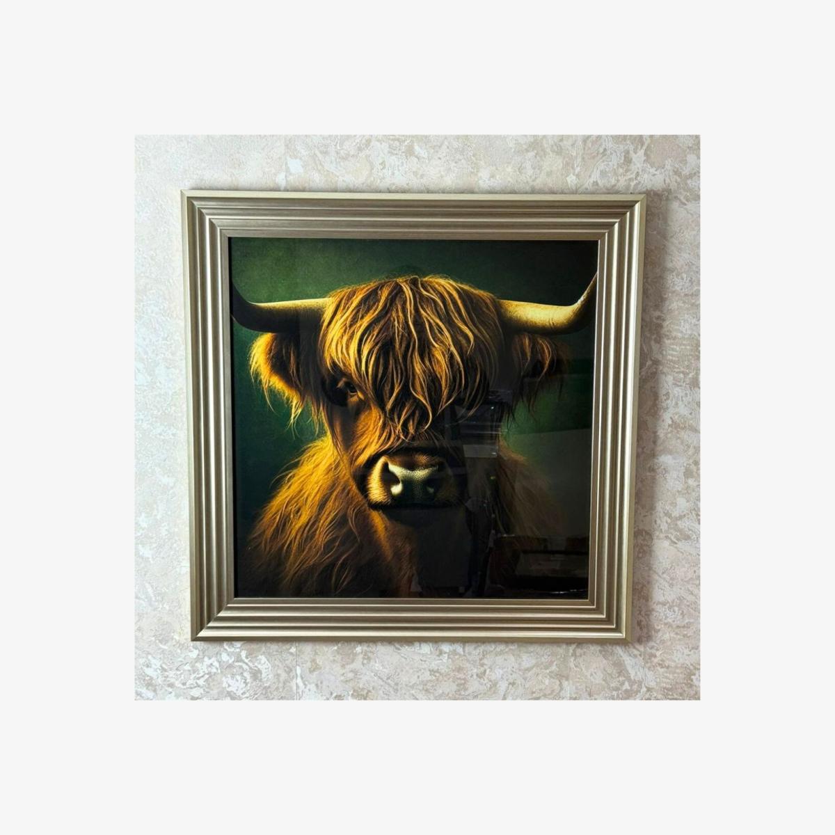 Highland Cow square wall art, featuring a champagne gold frame. Striking and full of presence, this wall art makes a bold statement with its powerful portrait of a highland cow set against a rich green background. The artwork captures the strength and stoic nature of this iconic animal with dynamic brushwork and vivid contrast, drawing attention to its expressive features and textured coat. Framed in a sleek champagne gold frame, this artwork is perfect for adding a touch of drama and natural character to a living room, hallway or study, bringing the majesty of the countryside into your home with confident, contemporary flair.