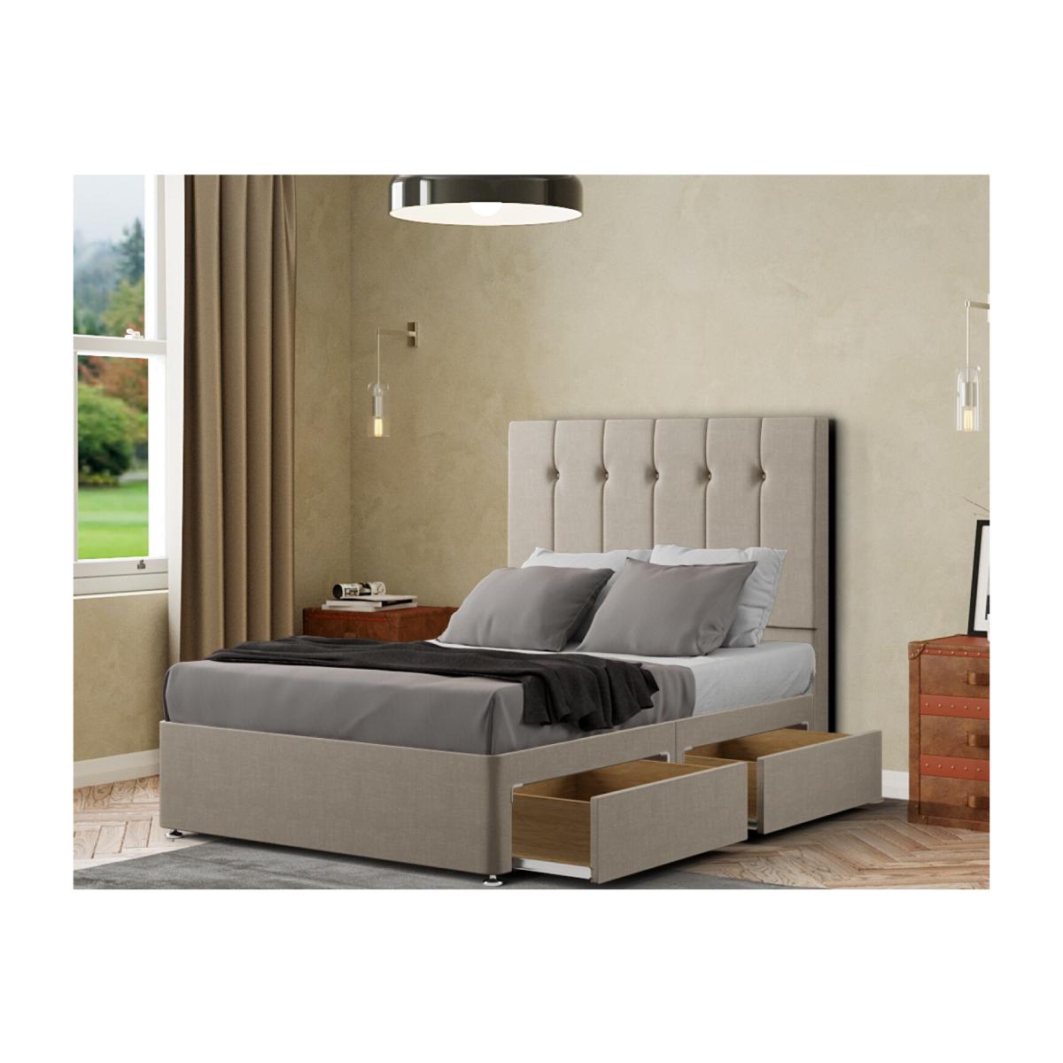 Introducing the Highland Divan Bed - Elevate Your Bedroom with British Craftsmanship. Made in the UK Crafted with precision and care, the Highland Divan Bed embodies British craftsmanship, ensuring enduring quality. Impeccable Design Featuring a floor-standing 54-inch headboard adorned with matching buttons, this bed exudes sophistication and elegance, adding a touch of luxury to your bedroom. Customize Your Style Express your unique taste with a variety of colors and fabric choices. The Highland Divan Bed is available in a range of options to seamlessly match your decor. All Sizes Available Whether you need a single, small double, double, king, or super king size, we have your perfect bed ready and waiting. Mattress Not Included Designed to pair seamlessly with your preferred mattress, the Highland Divan Bed allows you to create a personalized sleep sanctuary. Premium Quality Crafted with the finest materials, this divan bed boasts durability and comfort, promising years of restful nights. Elevate your bedroom with the Highland Divan Bed and experience the perfect blend of style, functionality, and quality. Transform your space into a haven of comfort and sophistication,order yours today.