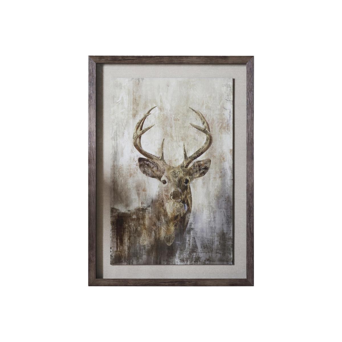 Add majestic natural beauty to your home with the stunning Highland Stag framed art print. This large piece of wildlife art in an open grain wood effect frame is float printed on a natural linen background giving the artwork an atmospheric chiaroscuro effect. The piece is hand finished with gold foil highlights that catch the light beautifully. Rich brown and umbre tones add warmth to any room. Powerful and dramatic, this lovely large artwork is sure to be a talking point. Dimensions. Width: 54cm(21in). Depth: 4cm (2in). Height: 74cm (29in).