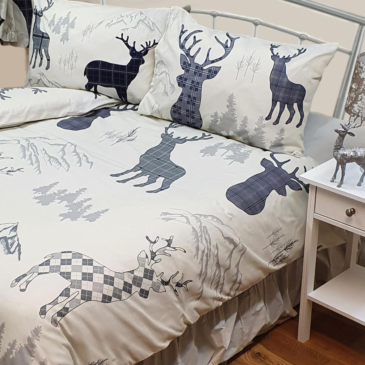 Stylish stag themed bedding range with matching accessories (available separately), in shades of grey, blue and taupe with various check designs. Soft and easy care fabric of 48/52 cotton/polyester, that is machine washable. Images are for illustration purposes, colours may vary. Set contains : 1 king size duvet cover (230x220cm) and 2 pillowcases (50x75cm) approx.