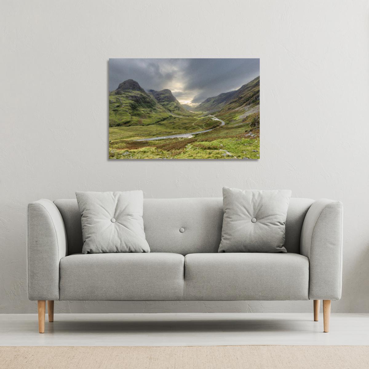 This Scottish landscape canvas adds a calming, natural touch to any space, making it particularly suited for relaxed, contemporary interiors or those with a touch of rural or rustic charm. I love how the greenery and moody sky bring a tranquil vibe and a splash of colour without overwhelming the room. It's perfect for living rooms, offices, or even bedrooms where a sense of calm is desired. Practical styling tips include pairing it with neutral-toned furnishings and adding some wooden or woven accents to enhance the natural theme. To really make it stand out, hang it at eye level on a feature wall or above a sofa, and consider layering with smaller prints or greenery to create a gallery-style display.