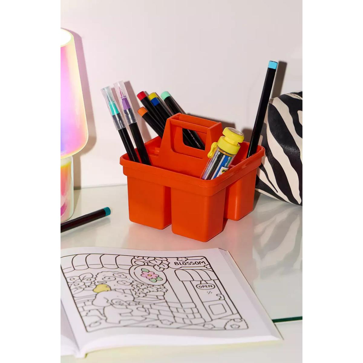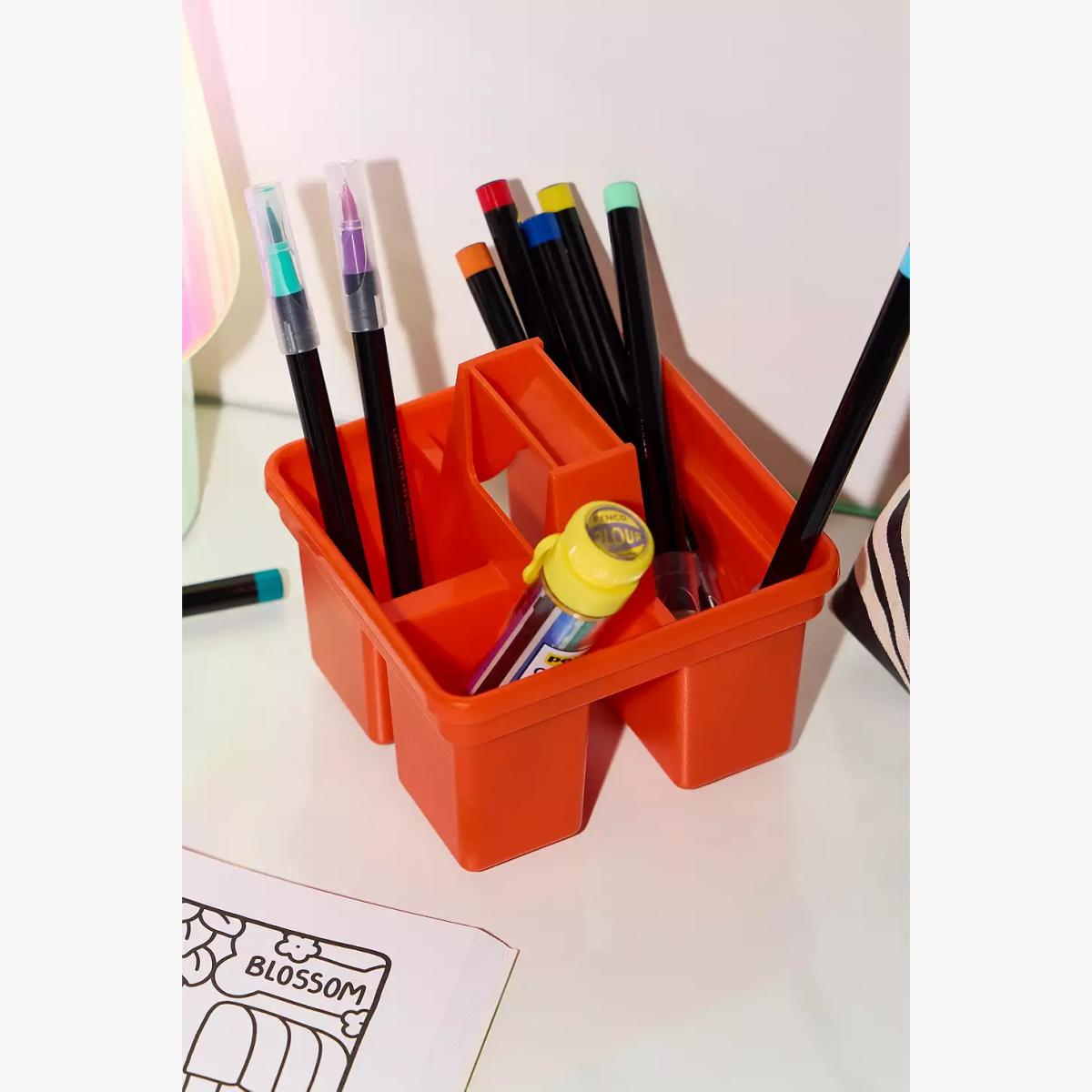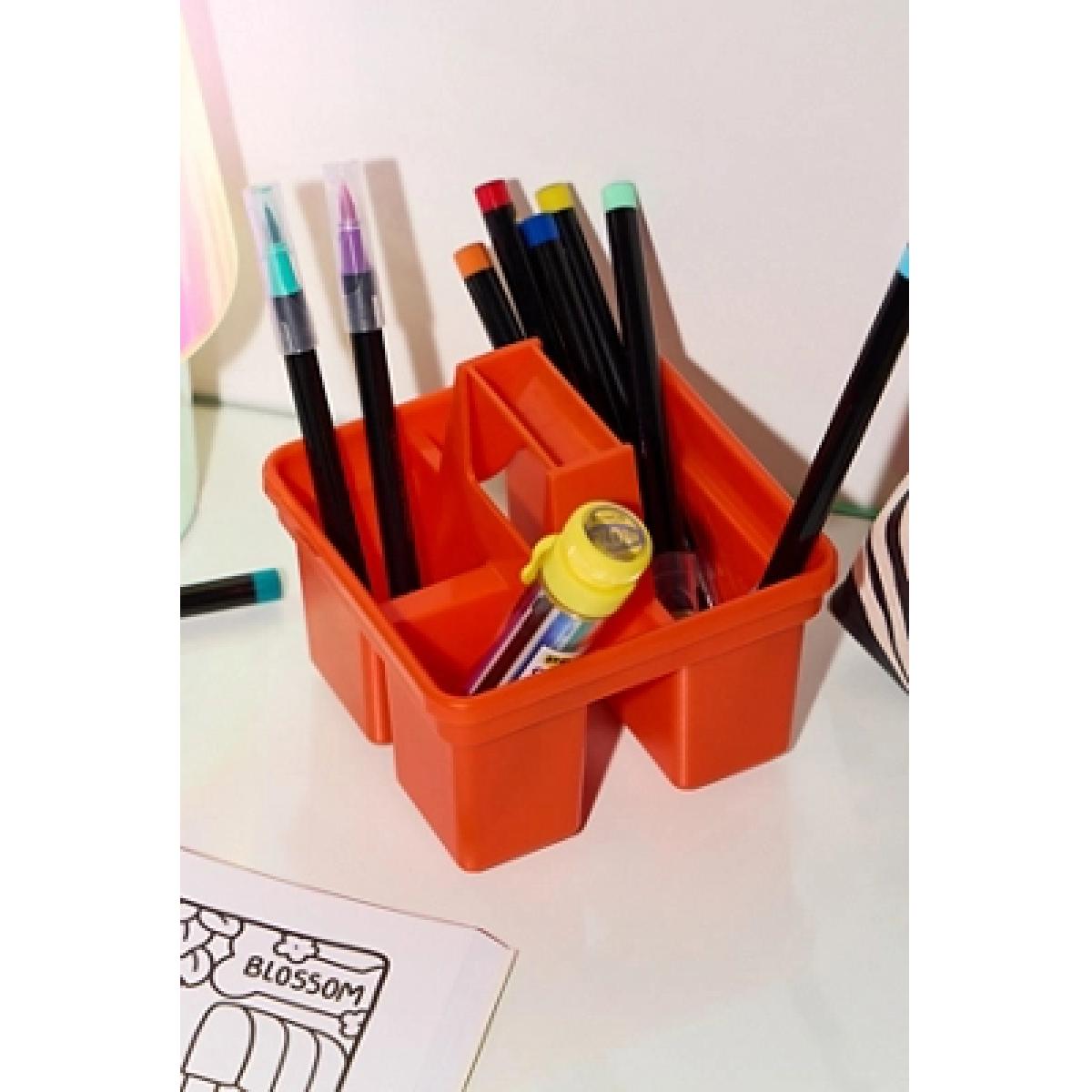 Vibrant desk organiser made from durable plastic in bold orange. Features multiple compartments and a central handle for easy portability. Ideal for keeping stationery, art supplies, and small tools neatly arranged and accessible. **Content + Care** \- Plastic \- Wipe clean **Size** \- 12.5 × 11.8 × 13.0 cm