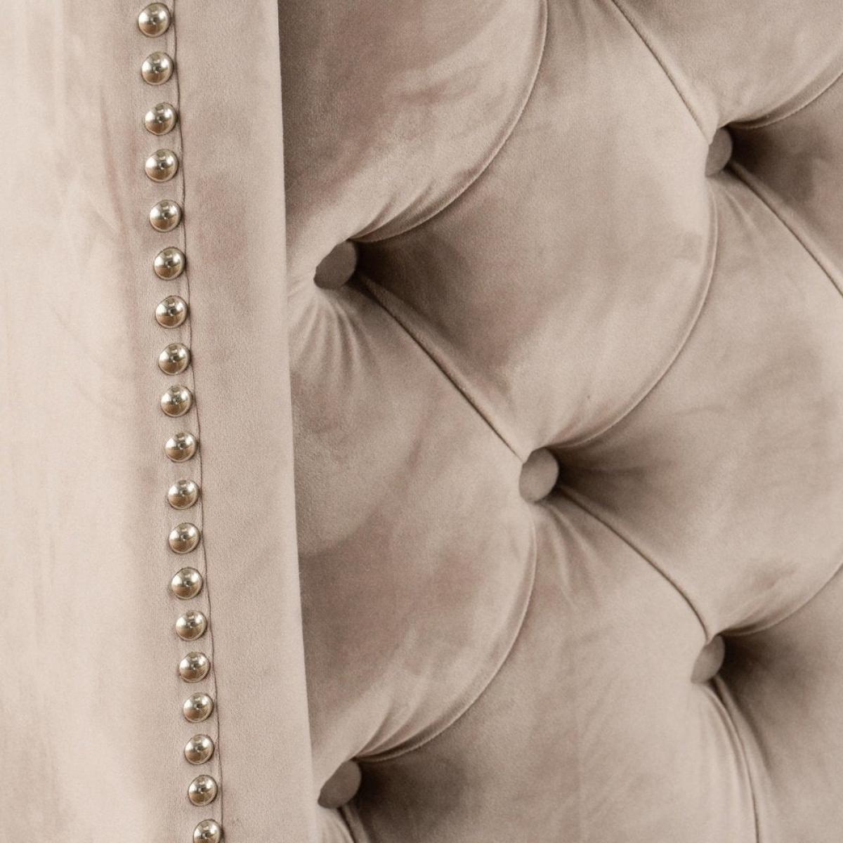 This is the Chelsea Button Pressed King Size Bed. A sumptuous button pressed king size bed in a beautiful neutral colour with button press headboard and studded details that will add elegance and class to a variety of bedroom decor schemes. All upholstered items have passed UK fire safety regulations with cigarette and match test certificates.