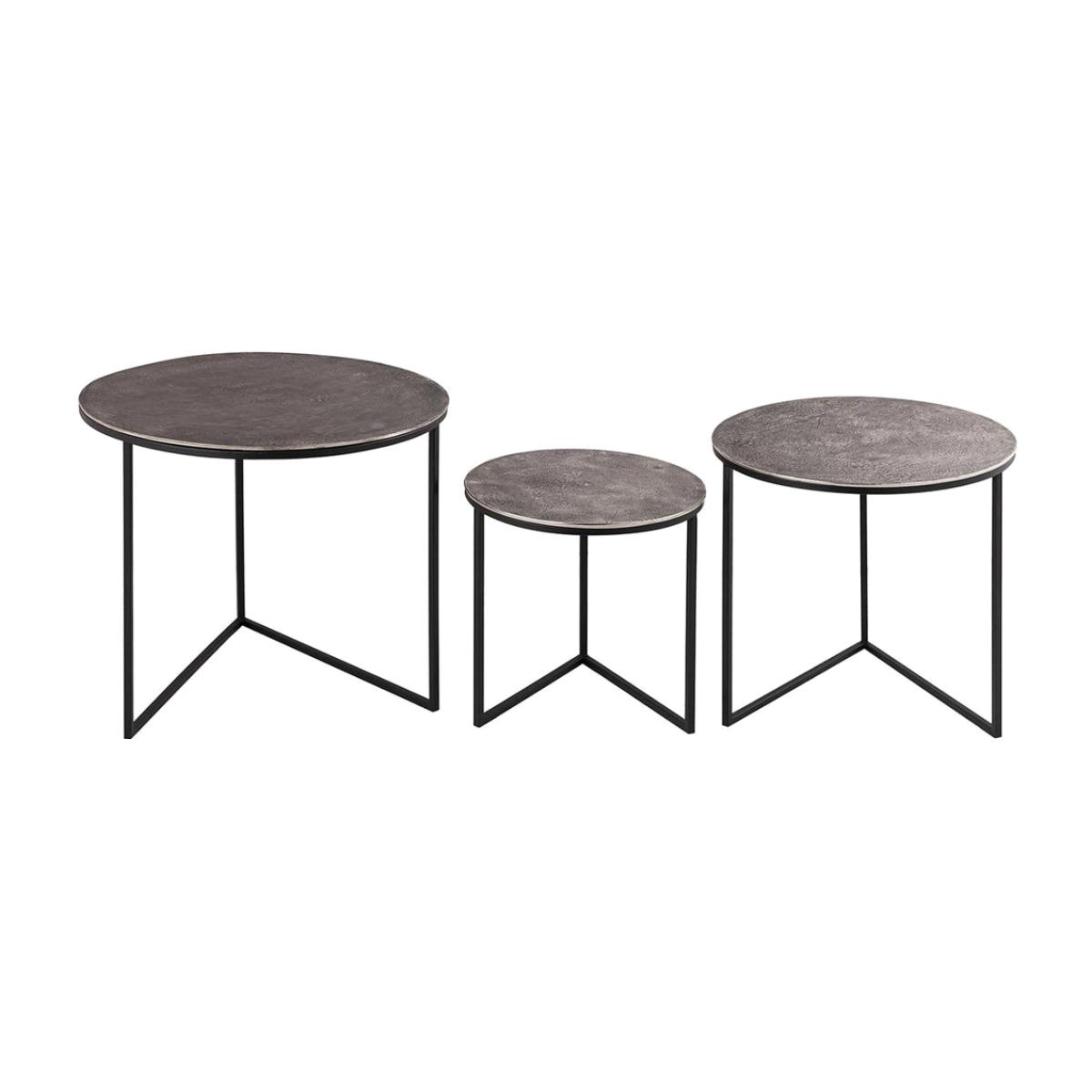 This is the Farrah Collection Set of Three Rounds Tables. Hand cast in aluminium, the casting process lends these pieces pitted, textured surfaces which are both eye-catching and hardwearing. Desig. View More. This is the Farrah Collection Set of Three Rounds Tables. Hand cast in aluminium, the casting process lends these pieces pitted, textured surfaces which are both eye-catching and hardwearing. Designed with versatility of use in mind, this collection comprises sturdy pieces which are also light enough to move around your home. With legs in a contrast painted black, this set of nesting tables will be a perfect fit with contemporary homes. Use this item's stunning surface to provide some flexible surface space around your home. A fantastic choice for living rooms that can be used to display table lamps and more.