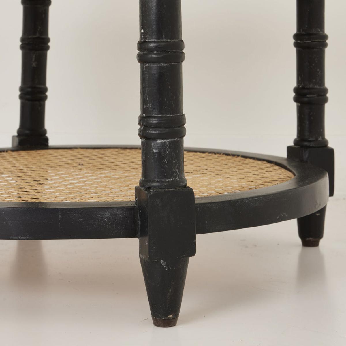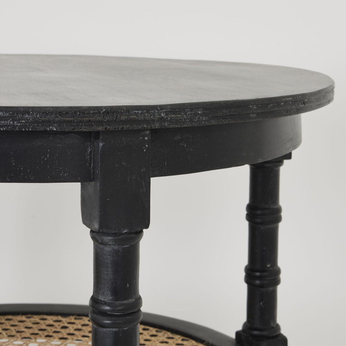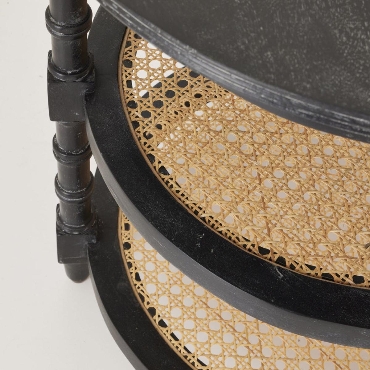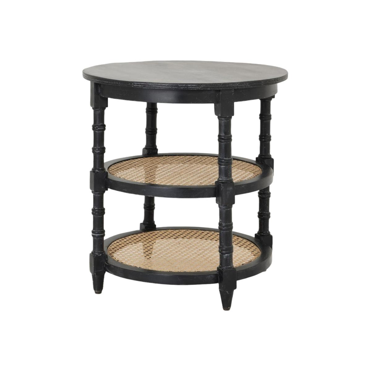 This is the Raffles Black Round Side Table. Handcrafted and painted, this mango wood side table's beautifully contrasting cane inlaid shelves set off its distinctive aesthetic and make the perfect base for creating stylish displays within the home. Dimensions: H: 60 x W: 60 x D: 60 cm Materials: Wood Care Instructions: Wipe with a clean, damp cloth