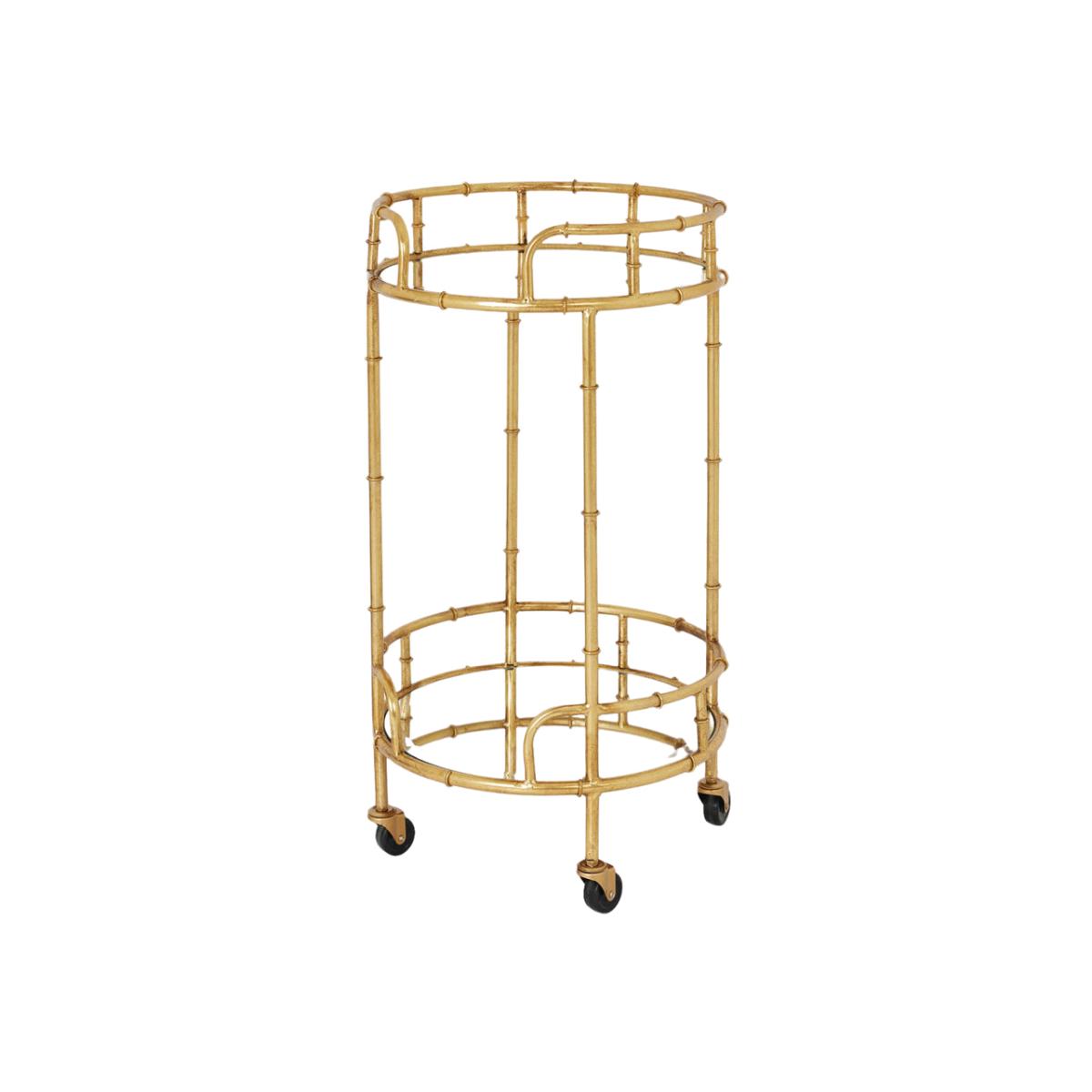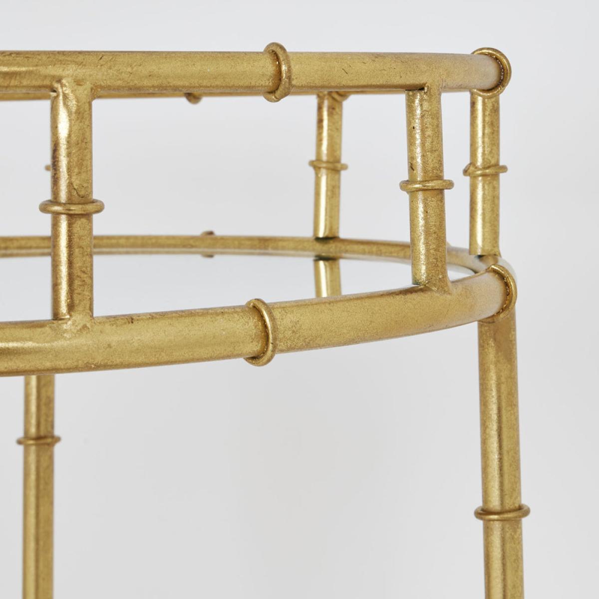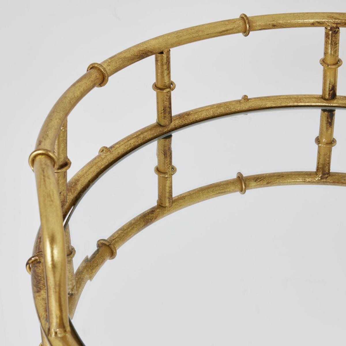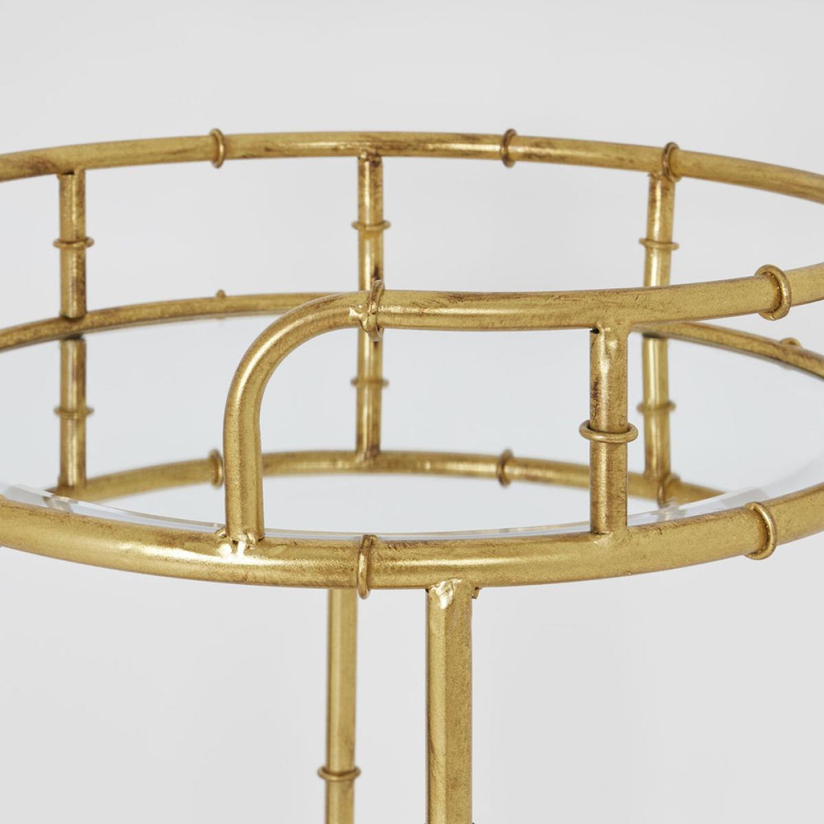 This is the Gold Round Drinks Trolley. Create your own mini bar with this stylish drinks trolley and keep your favourite tipple close to hand. This moveable and compact drinks trolley is perfect for home-entertaining. With two mirrored surfaces, this gold coloured metal trolley has space for both drink mixing and display. Elevate your home's entertaining capabilities with this moveable mini bar option. Dimensions: H: 81 x W: 45 x D: 45 cm Materials: Glass Care Instructions:Wipe with a clean, damp cloth