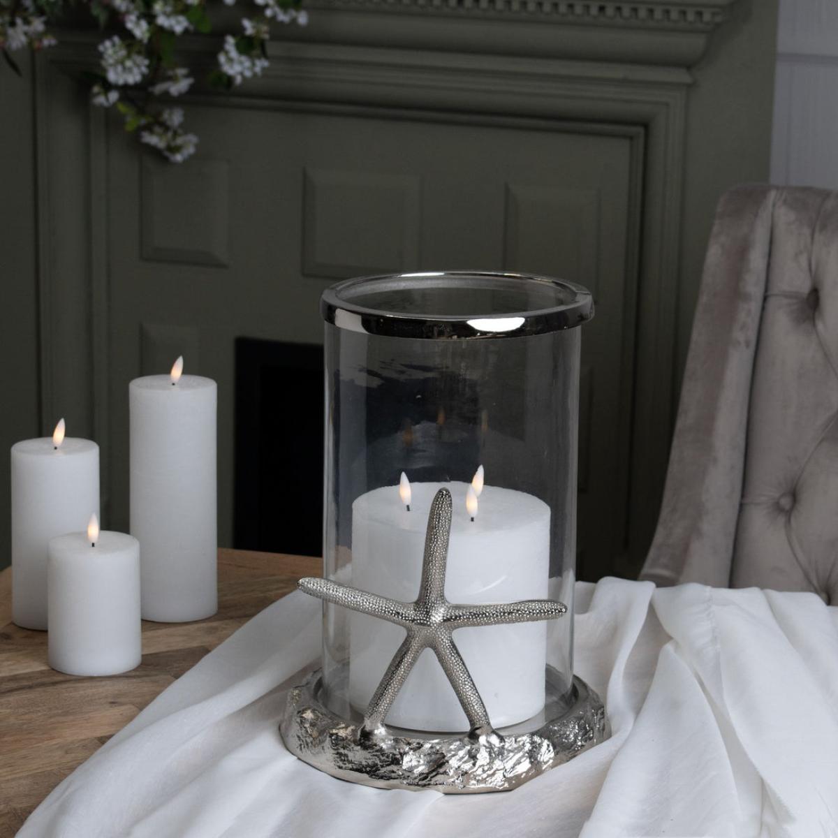 This is the Silver Starfish Candle Hurricane Lantern. A beautiful raised silver starfish adorns a central glass hurricane lantern. Individually handcrafted with beautiful detailing, it will elevate any space. Simply fill with your favourite candle and enjoy! Compatible with our three wick, LED candles, as shown. For the use of LED faux candles.