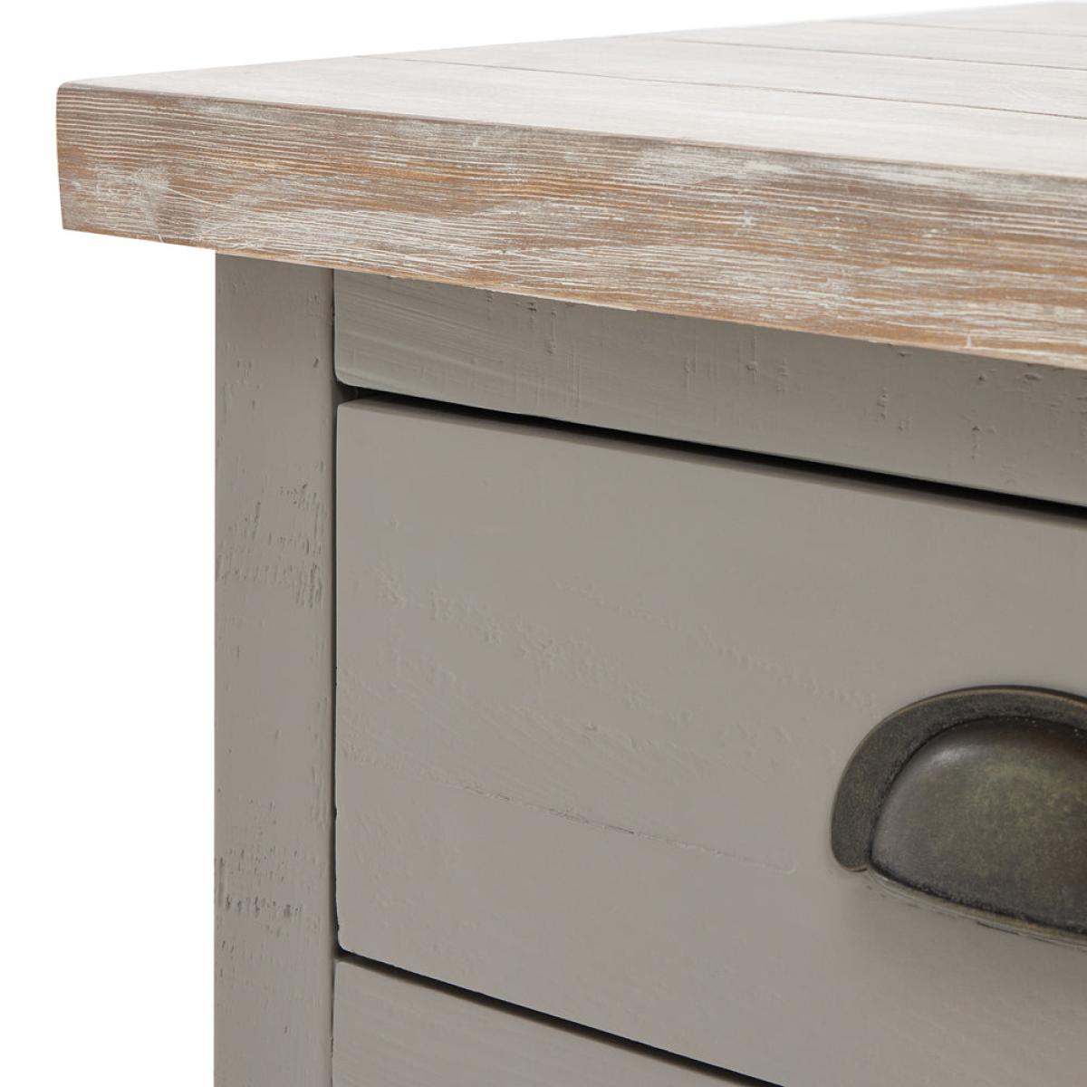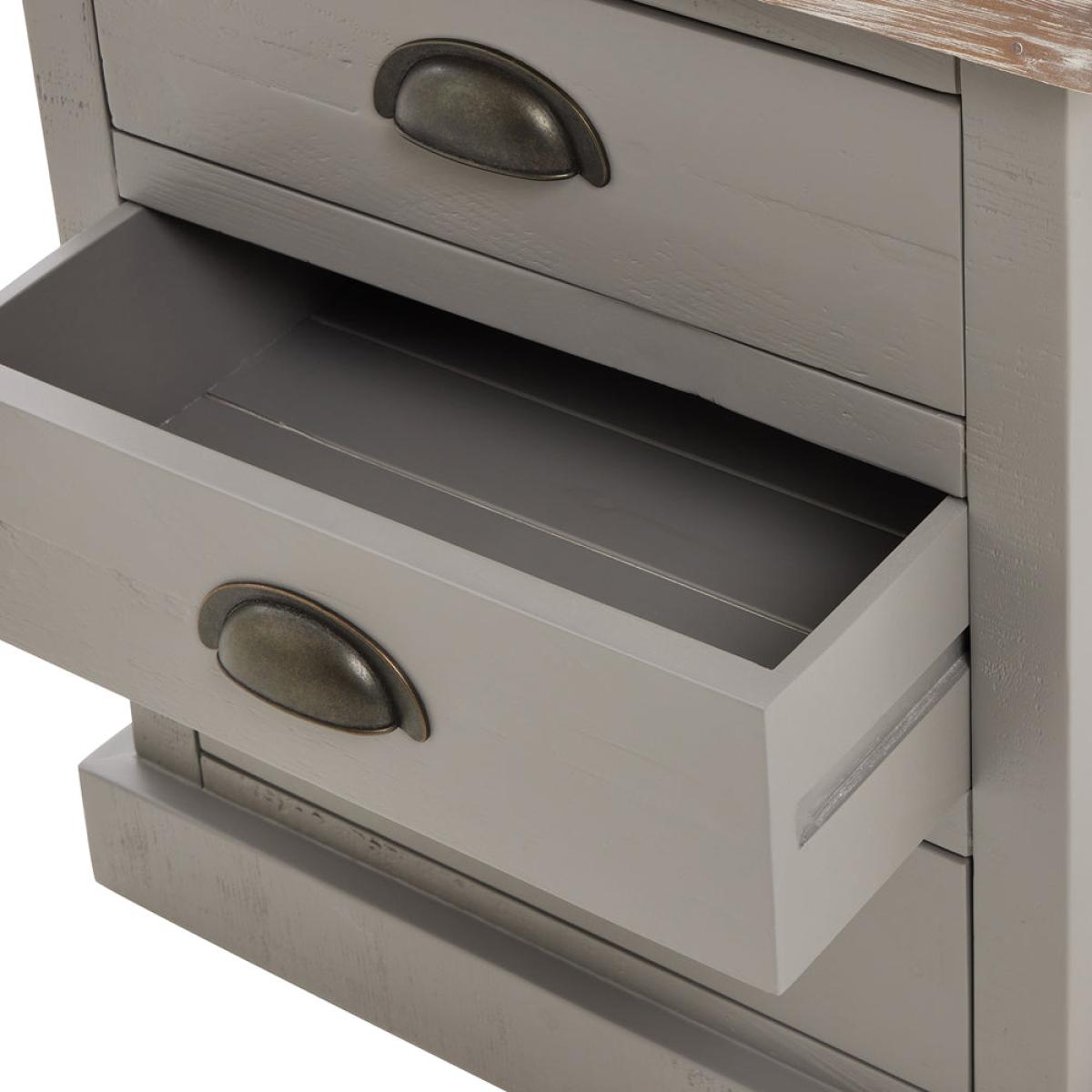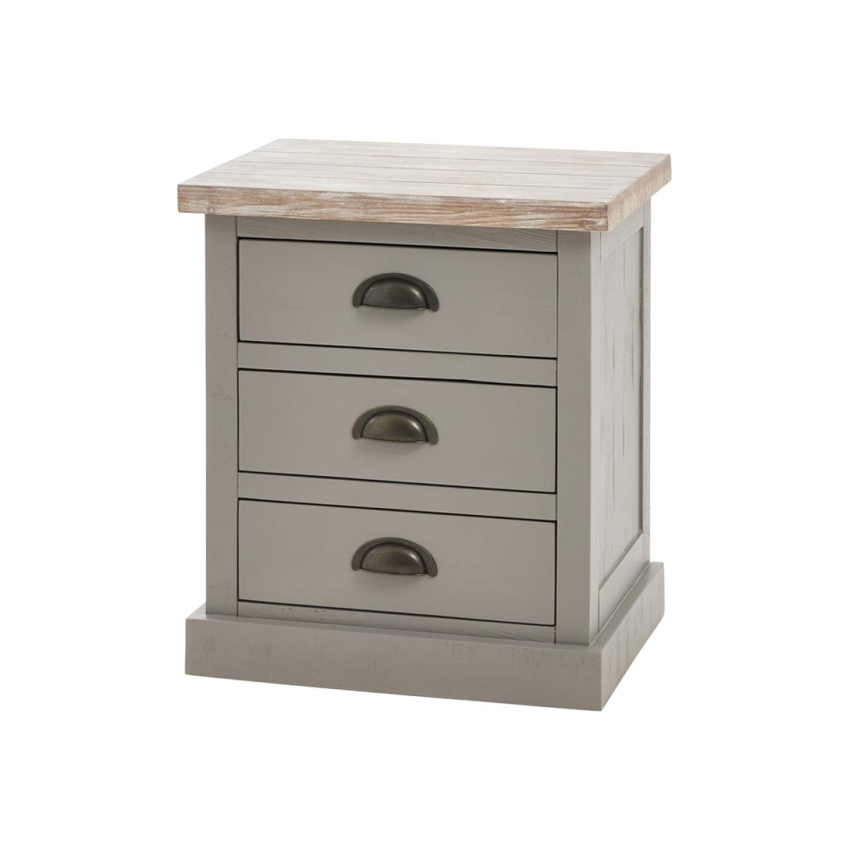 The Oxley Collection Bed Side boasts three useful drawers, perfect for keeping its washed wood surface clutter free and providing the space needed for a bed side lamp and other essentials. Stylish. View More. The Oxley Collection Bed Side boasts three useful drawers, perfect for keeping its washed wood surface clutter free and providing the space needed for a bed side lamp and other essentials. Stylish as well as functional, this bedside table will provide the perfect, useful finishing touch to the bedroom. This item is part of the Oxley Collection which marries rustic and contemporary aesthetics to deliver a robust range suited to a wide variety of homes. Individual, rough-sawn pine planks are used to create these items, delivering its characterful, worn vibe. The product bases are lightly brushed with a moody, timeless grey hue allowing the grain of the wood to still be visible. This is complemented with the washed pine top, bringing the whole look together. With simple, clean lines a contemporary feel is created by the black cup handles. The Oxley Furniture Collection is sure to stand the test of time both in style and quality.