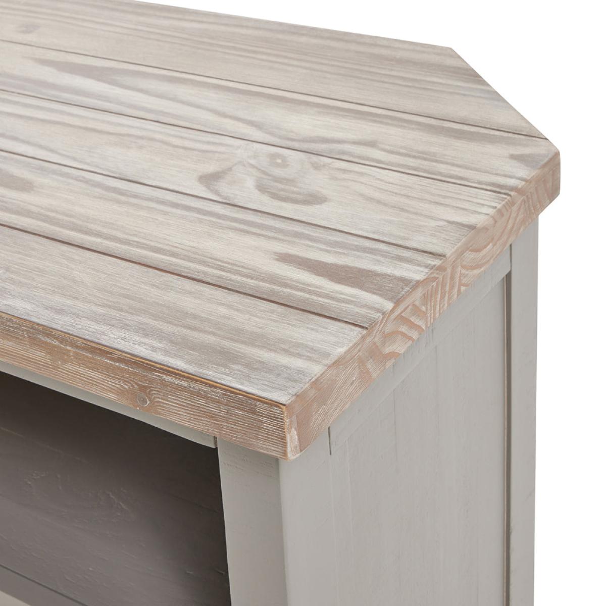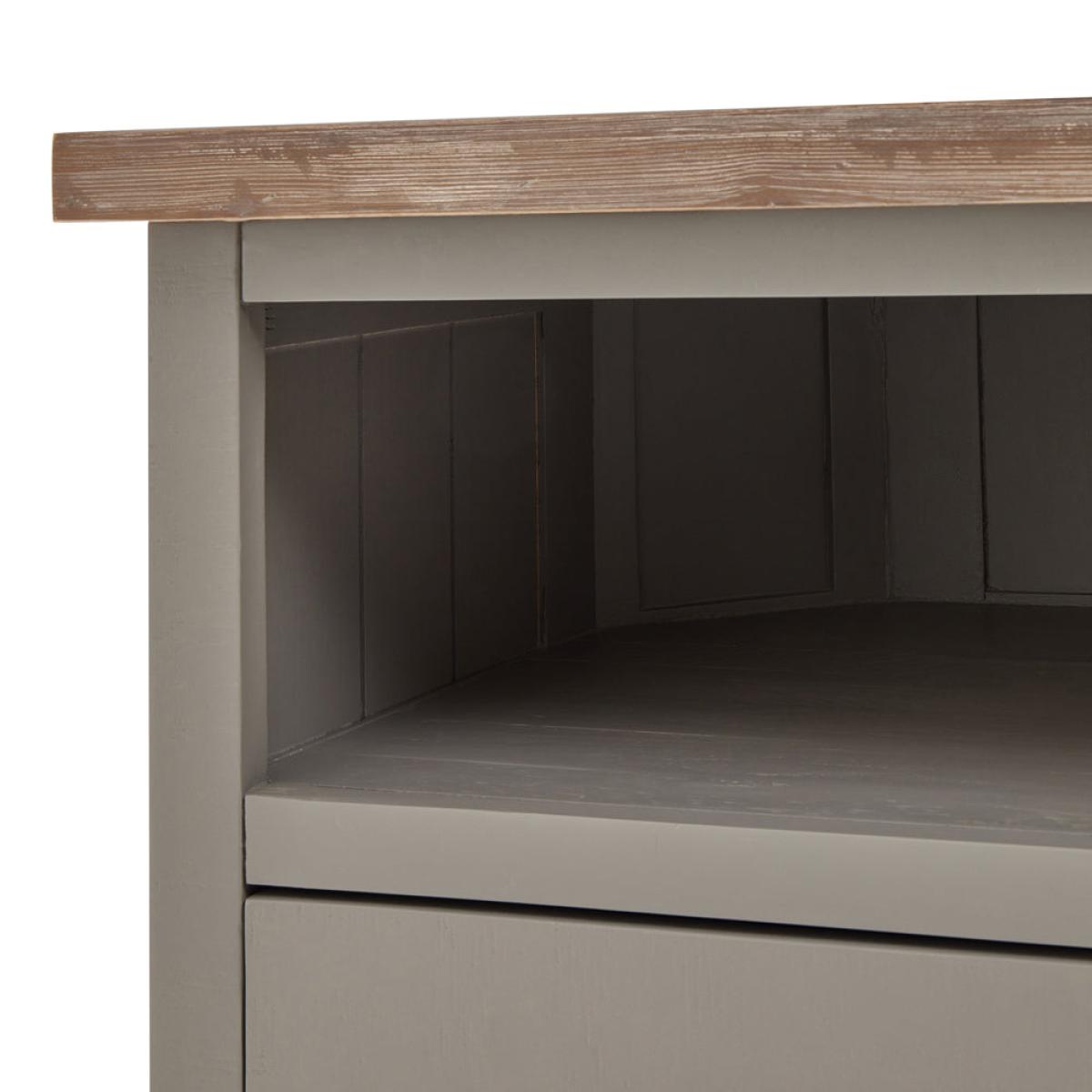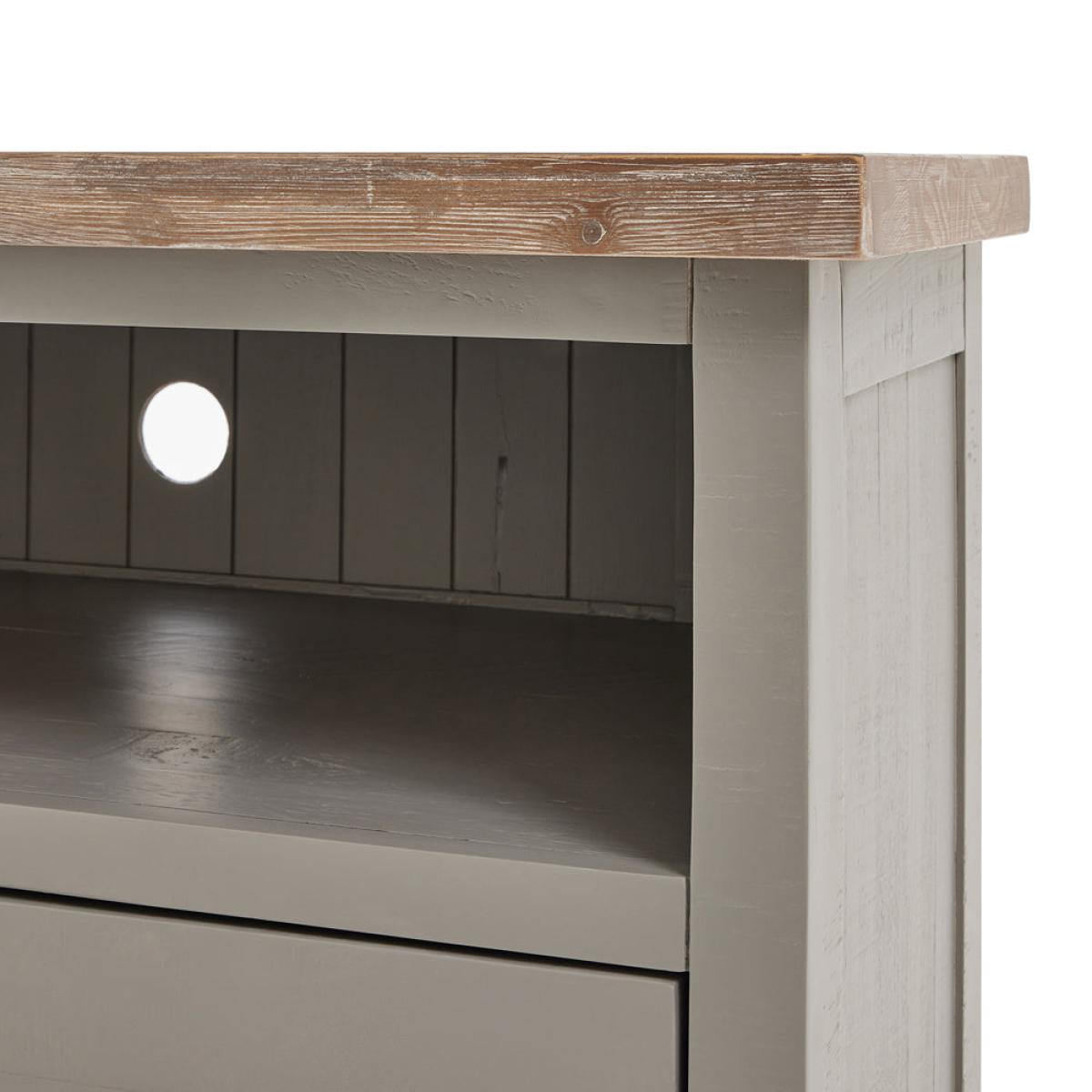The Oxley Collection TV Unit boasts a useful drawer and shelf, circular hole to manage unsightly wires and corner-friendly shape. Its features are all designed to help keep its washed wood surface. View More. The Oxley Collection TV Unit boasts a useful drawer and shelf, circular hole to manage unsightly wires and corner-friendly shape. Its features are all designed to help keep its washed wood surface clutter free and provide the space required for modern home entertainment essentials. Stylish as well as functional, this side table would be equally at home centre stage in a room as tucked into a corner. This item is part of the Oxley Collection which marries rustic and contemporary aesthetics to deliver a robust range suited to a wide variety of homes. Individual, rough-sawn pine planks are used to create these items, delivering its characterful, worn vibe. The product bases are lightly brushed with a moody, timeless grey hue allowing the grain of the wood to still be visible. This is complemented with the washed pine top, bringing the whole look together. With simple, clean lines a contemporary feel is created by the black cup handles. The Oxley Furniture Collection is sure to stand the test of time both in style and quality.