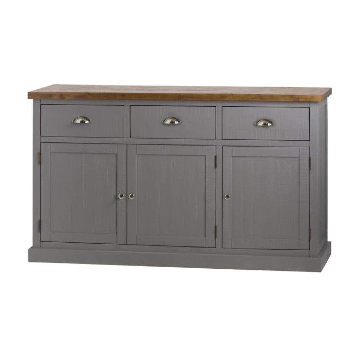 The three drawer three door sideboard from the Byland range brings welcome storage into any interior, with three spacious drawers and three cupboard compartments, this piece can be utilised in various areas of a home, hotel or venue. Featuring a warm grey painted finish and natural pine top, this piece gives a rustic and handmade look which adds to the authenticity of this range. Width: 153 cm x Depth: 48 cm x Height: 90 cm.