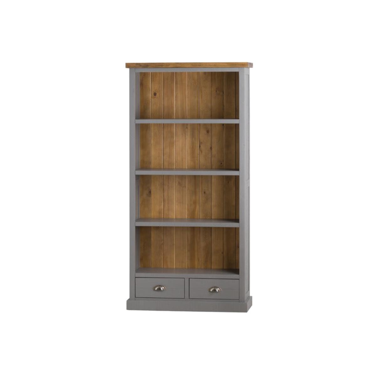 The Byland Collection Two Drawer Bookcase provides a stylish element of storage in any interior, with two drawers and various shelves an ample amount of space is created to display other ornaments, books, movies or CD's on. Finish with a warm grey hue that has been lightly painted so the woodwork can still be seen beneath along with contrasting natural pine features and silver handles, this is a timelessly stylish piece. Width: 92 cm x Depth: 35 cm x Height: 180 cm.