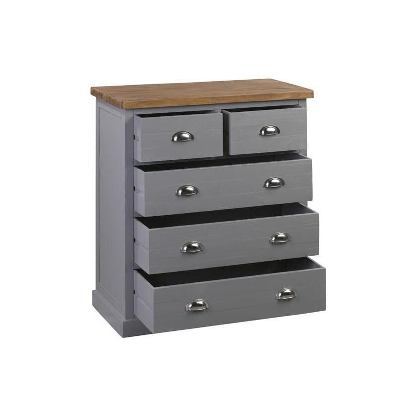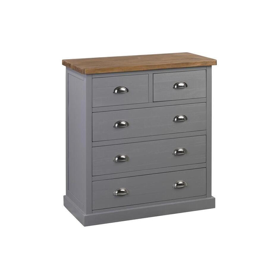 The Byland Collection Two Over Three Chest of Drawers provides welcome storage space in a package full of style. Made from individual planks that have been lightly painted in a warm grey hue plus a natural pine top, this piece is guaranteed to fit into many interior decor schemes and can be accesorised to create the desired look. The silver handles finish this piece beautifully and create a timeless look.