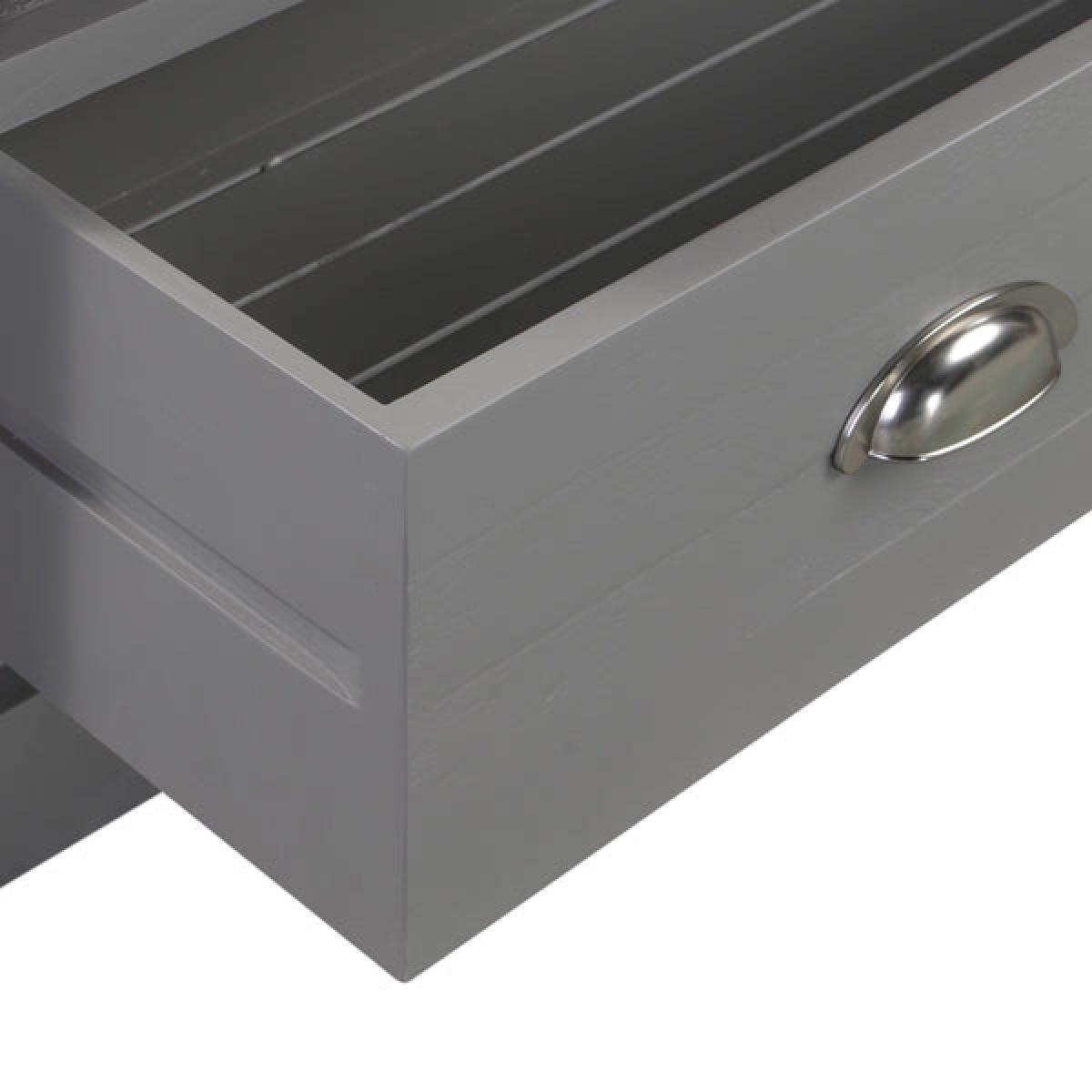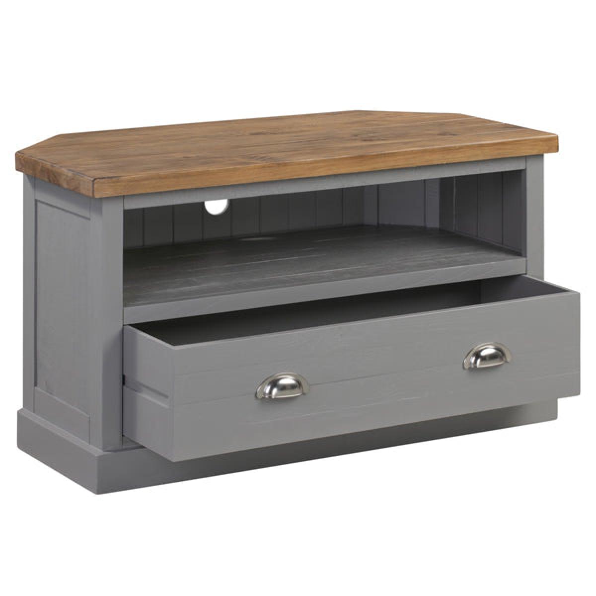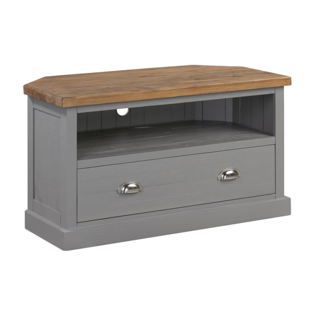 The Byland Corner TV Unit features a rustic and handmade look complete with a lightly painted grey finish and complementing natural pine features. This piece is ideal to fit into the corner of any room to create a place for TV's and to help keep wires tidy. With individual planks used to create these pieces and the wood grain still visible through the paint, a worn and homely feel is derived from this range.