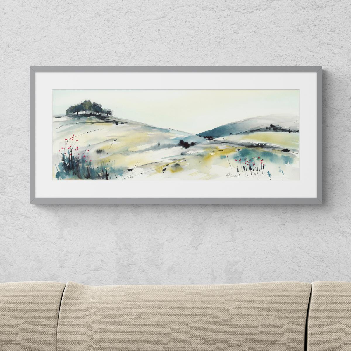 This piece, Hillside In Spring, is a versatile and calming artwork that works well in both contemporary and rustic interiors. I love its understated colour palette and delicate brushwork, which add a touch of tranquillity without overpowering the space. It pairs beautifully with neutral tones and can be a great focal point above a sofa or sideboard. For practical styling, consider framing it with a simple mat to enhance its clean lines, and hang it at eye level for the best visual impact. It’s perfect in living rooms, bedrooms, or even hallways, where it can bring a subtle hint of nature indoors.
