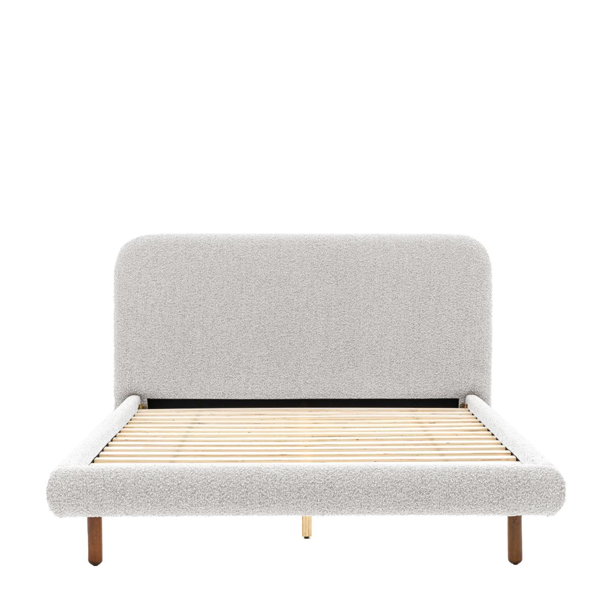 * Wooden Bed Frame* Slatted Base* Curved Headboard Upholstered in a boucle fabric with a captivating bobble texture, this bedstead exudes understated elegance. The slim wooden legs and gently curved headboard add to the bed frame's modern appeal, creating a serene and inviting sleeping space.