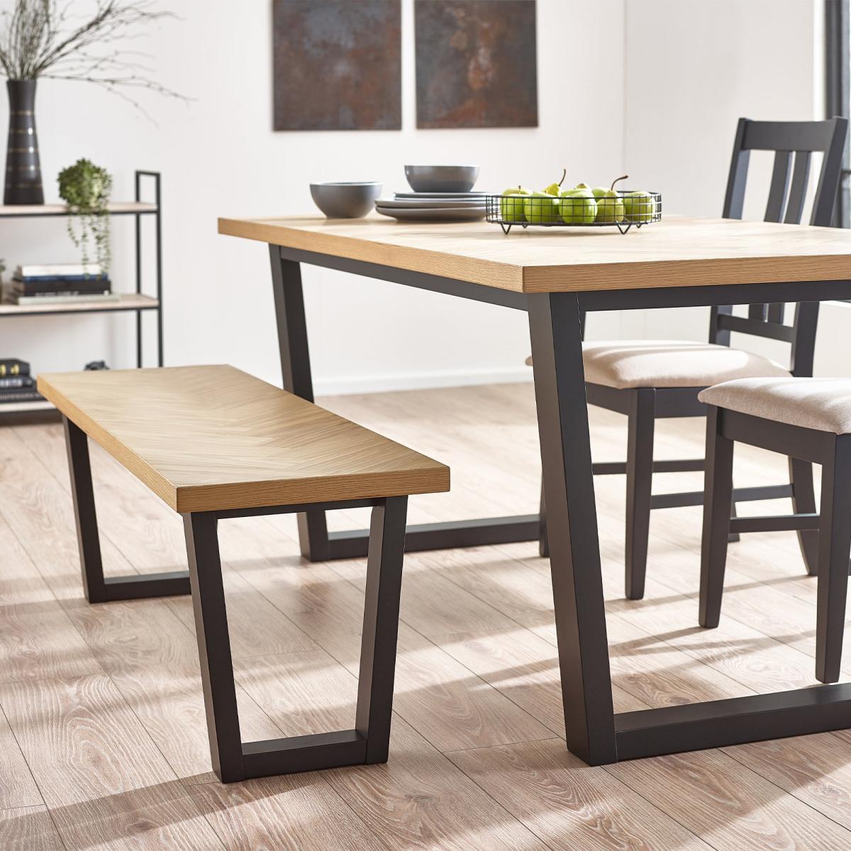 * White oak veneer with herringbone pattern* Black industrial legs* Seats up to 3 people The Hilton Bench combines classic and minimalistic design elements, crafted from white oak veneer with a beautiful herringbone pattern. Supported by sturdy black industrial-style legs, this bench creates a timeless and modern look that blends with any home décor. The Hilton Bench offers a versatile seating option that can be used in various settings, from dining rooms to entryways.