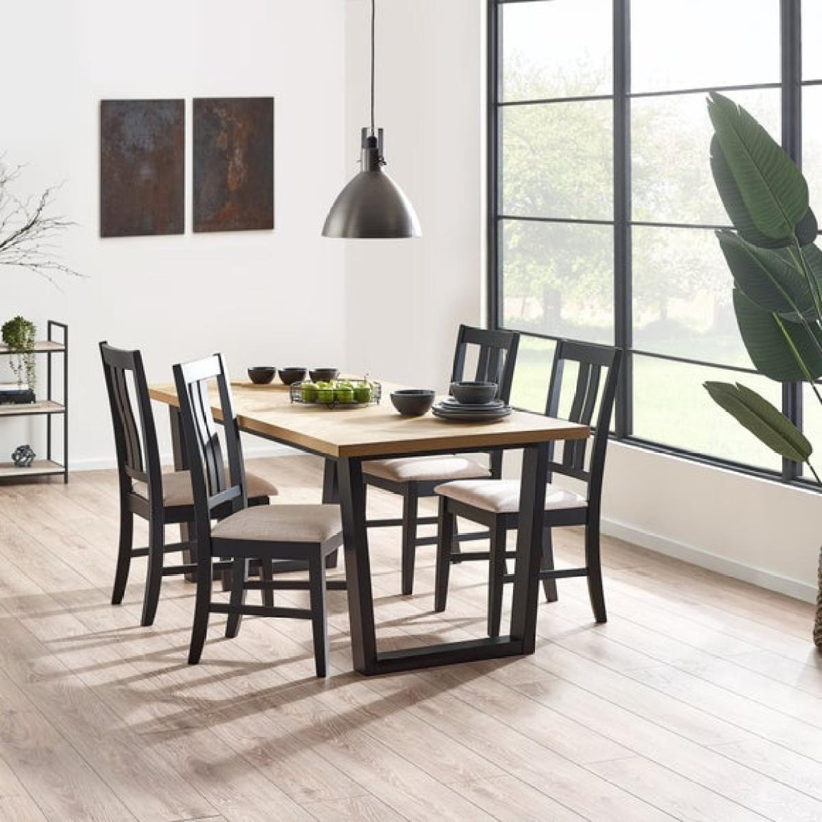 I love this dining set for its versatile and clean design, making it a great centrepiece for both modern and traditional interiors. The mix of the light timber top with the darker frame creates a stylish contrast, while the rectangular shape provides ample space for family mealtimes or casual gatherings. It works particularly well in open-plan kitchens or dining rooms that benefit from functional, yet understated furniture. To style it effectively, consider adding a colourful runner or statement tableware to introduce personality, or layer with textiles such as placemats and chairs cushions for extra comfort. Understated, practical, and adaptable - it’s a solid choice for those wanting a contemporary yet timeless dining area.