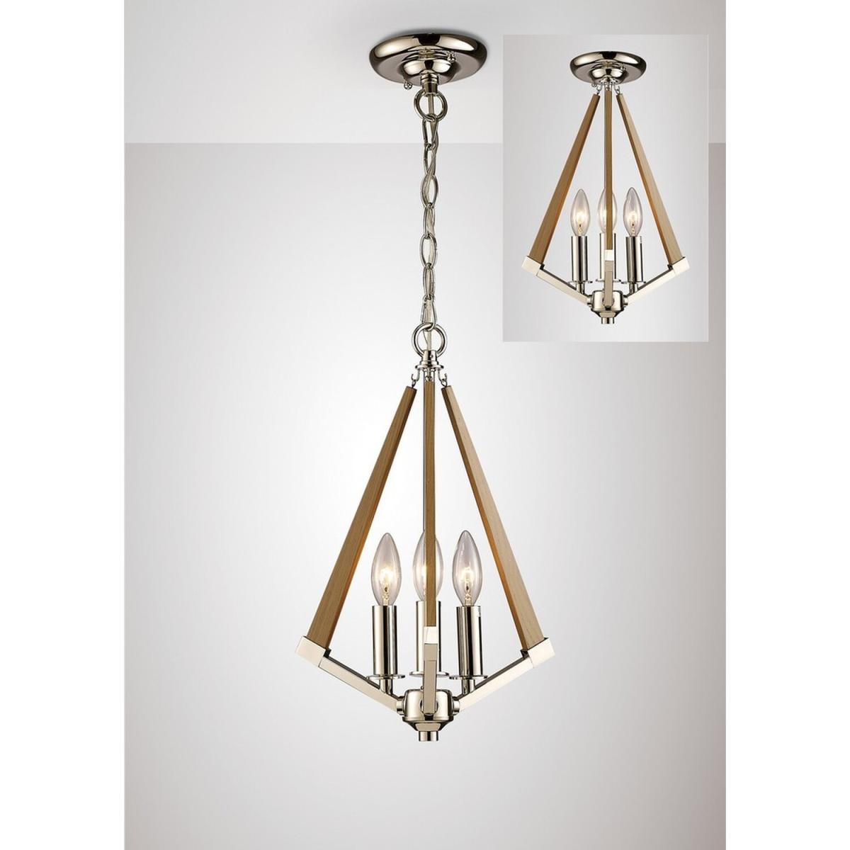 I love this pendant for its blend of classic and modern elements, making it quite versatile in various interiors. The polished nickel finish offers a sleek, contemporary look, while the taupe wood accents add warmth and texture, suited for both transitional and eclectic spaces. It's perfect for hanging over a dining table or in a living room where a statement piece is desired, but it also works well in neutrally styled kitchens or hallways. For practical styling, consider pairing it with similar metal finishes or understated decor to highlight its architectural shape without overpowering the space. A dimmer switch can also help adapt the mood, making this light as functional as it is stylish.
