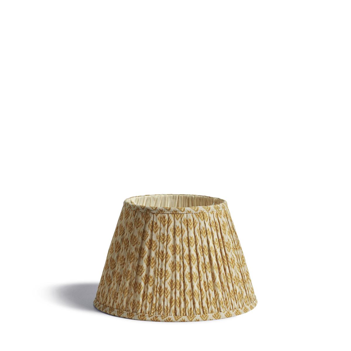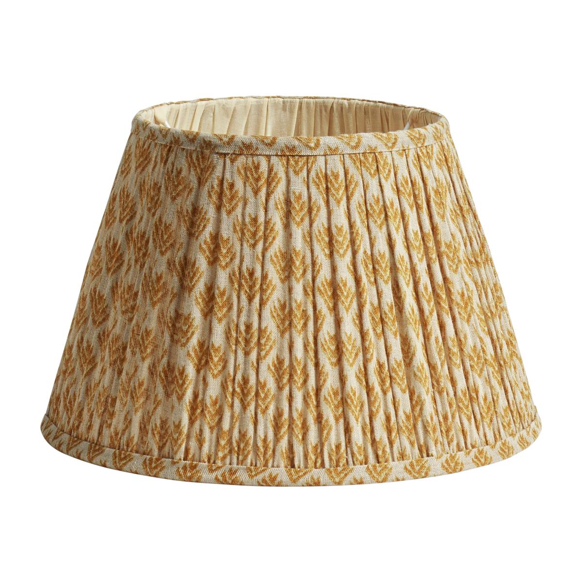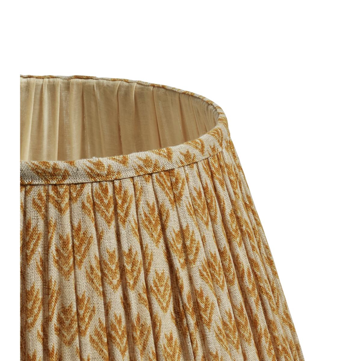Our Hirkani Range of cushions and lampshades is named for the small diamond motifs used to adorn them. Inspired by Punjabi Phulkari patterns, our lampshades feature a modern take on the classic design, digitally printed onto a linen voile that is gathered by hand and pleated onto a metal frame. This version is the smaller of our warm mustard yellow lampshades. Please note: colour tones will vary from piece to piece.