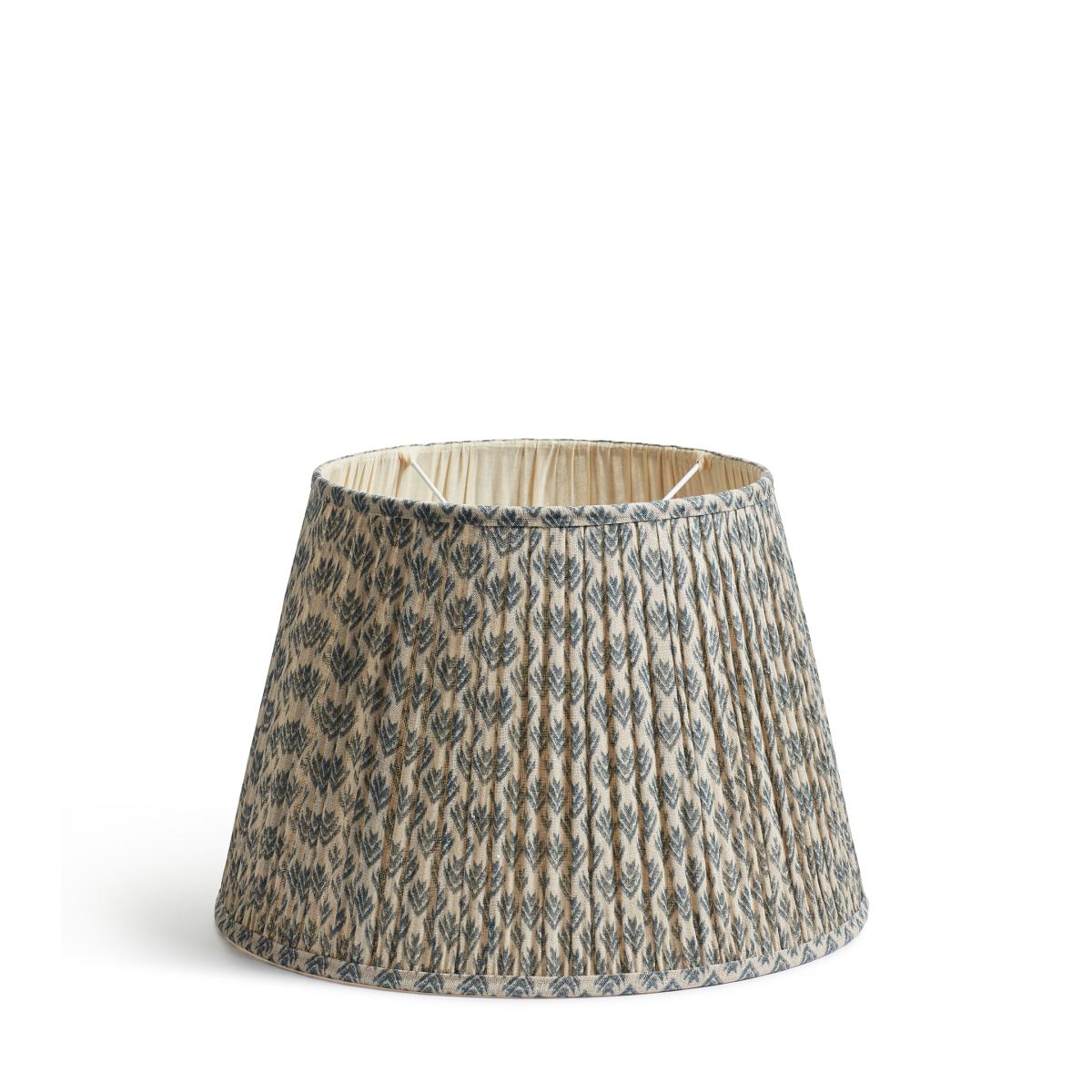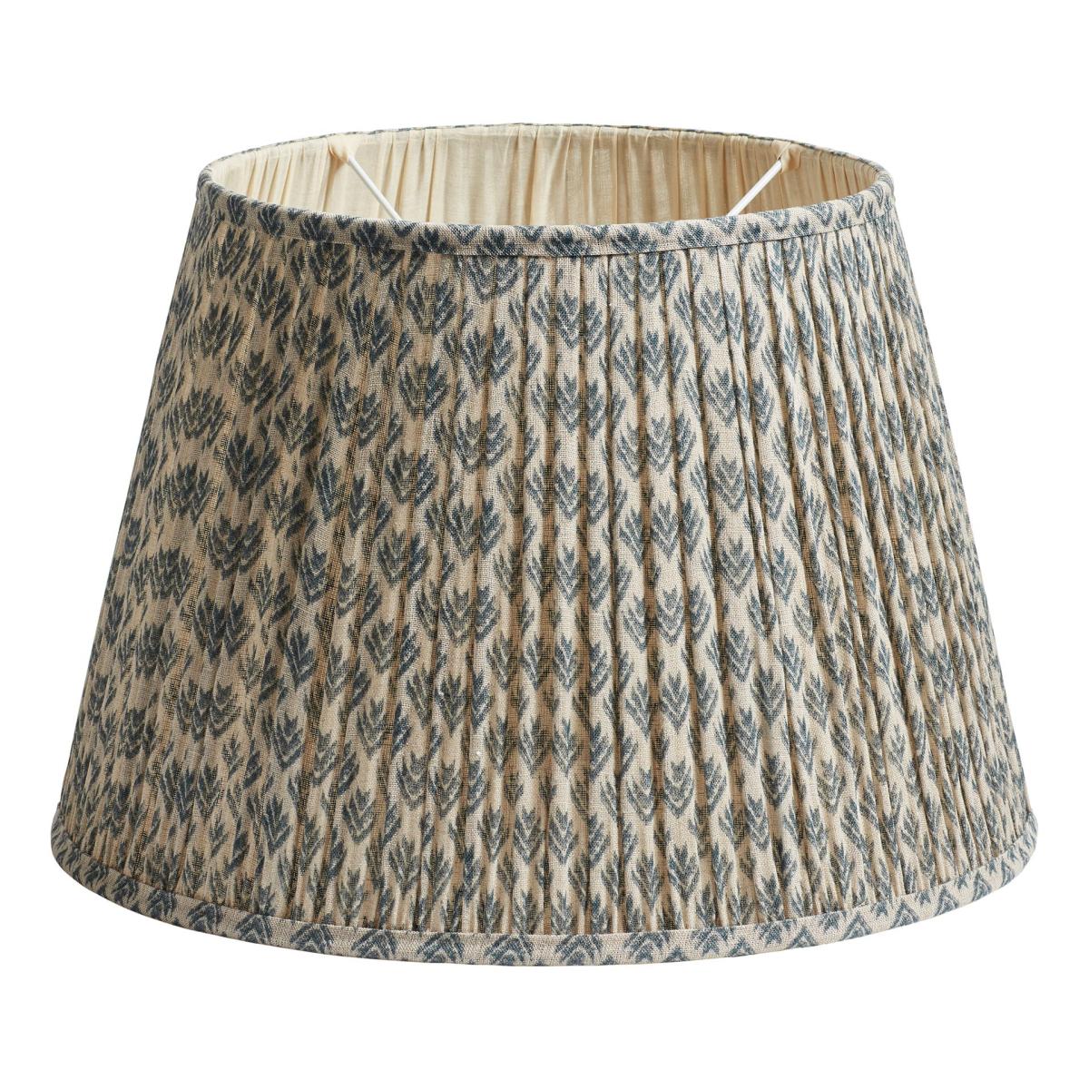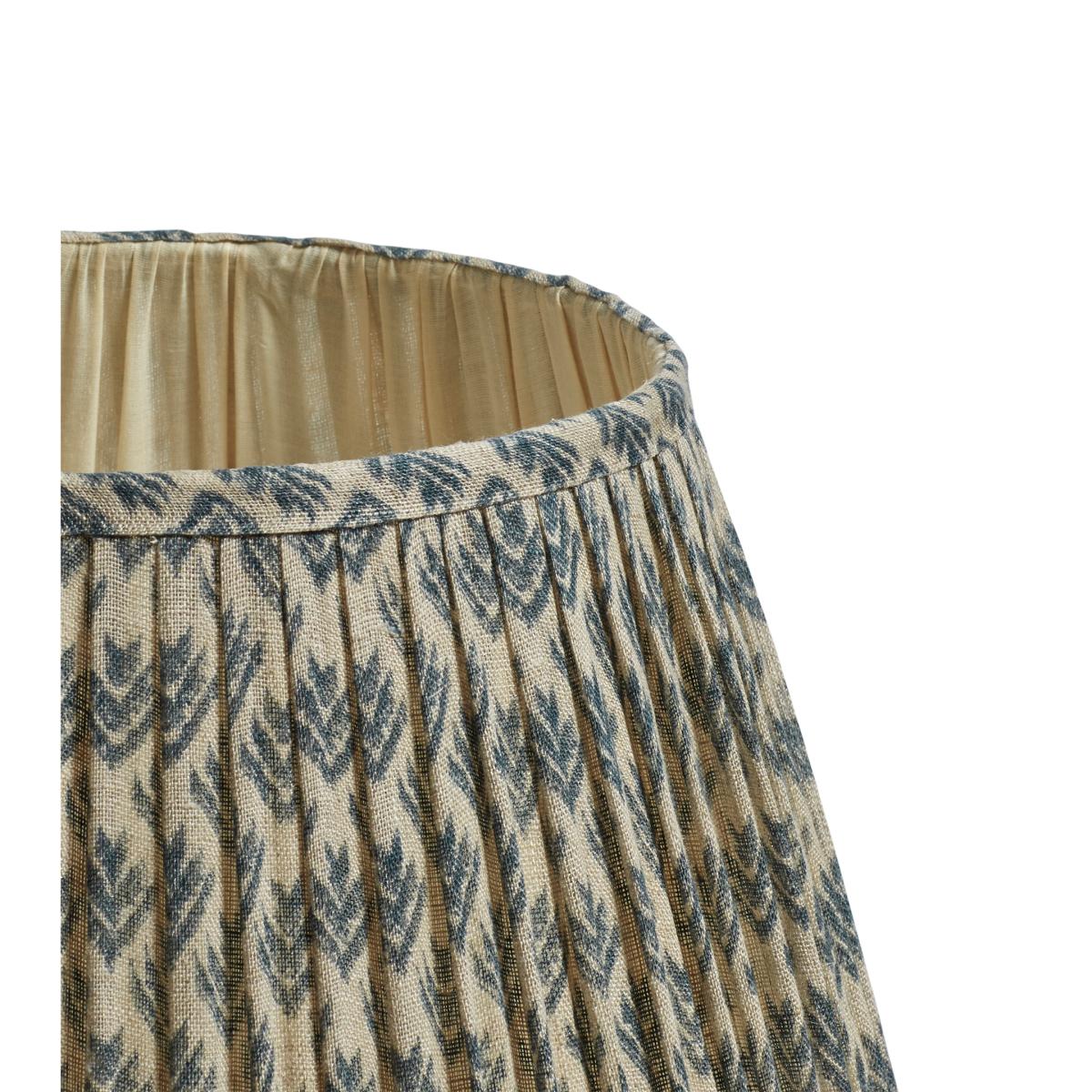 Our Hirkani Range of cushions and lampshades is named for the small diamond motifs used to adorn them. Inspired by Punjabi Phulkari patterns, our lampshades feature a modern take on the classic design, digitally printed onto a linen voile that is gathered by hand and pleated onto a metal frame. This version is the larger of our cool Air Force Blue lampshades.