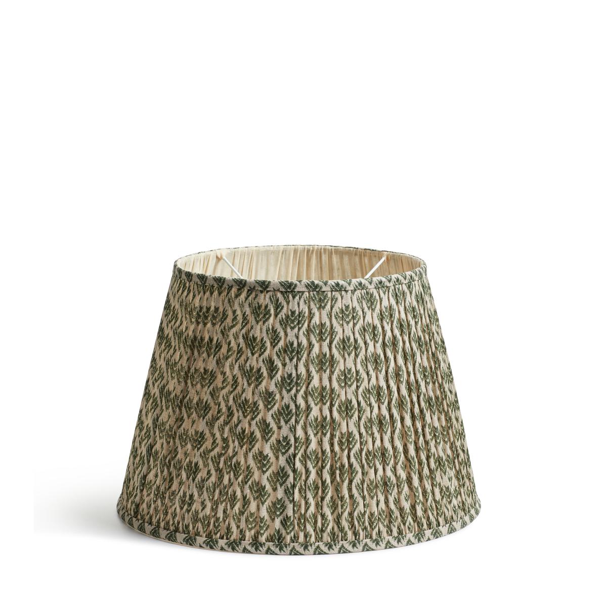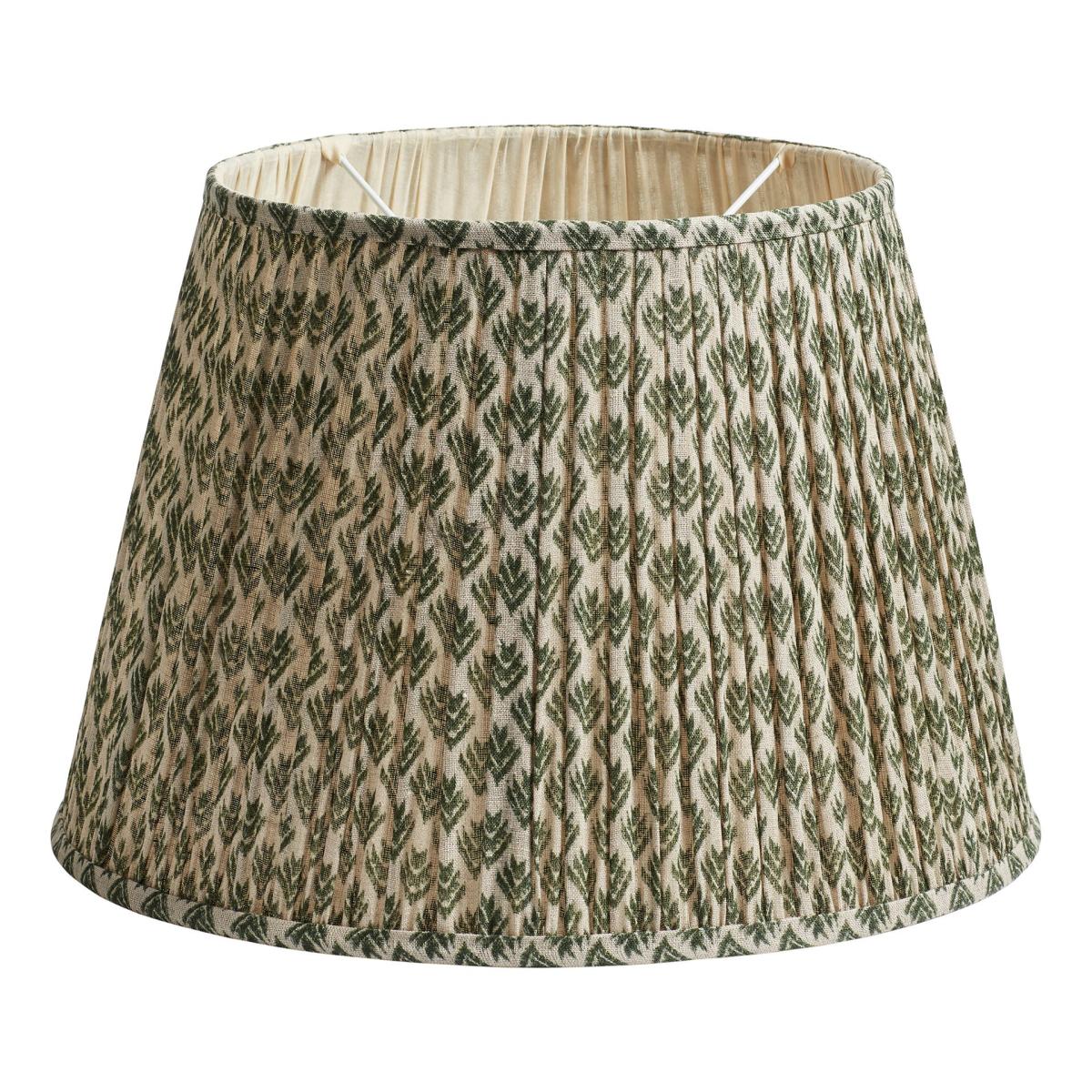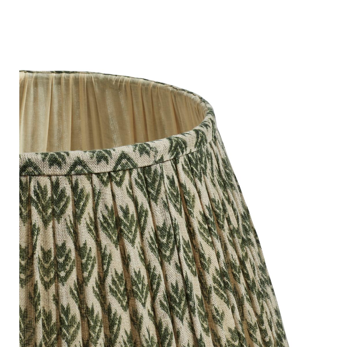 Our Hirkani Range of cushions and lampshades is named for the small diamond motifs used to adorn them. Inspired by Punjabi Phulkari patterns, our lampshades feature a modern take on the classic design, digitally printed onto a linen voile that is gathered by hand and pleated onto a metal frame. This version is the larger of our fresh-green lampshades. Please note: colour tones will vary from piece to piece.