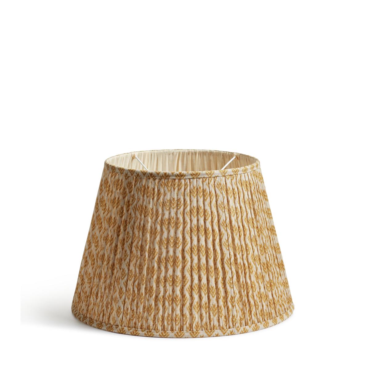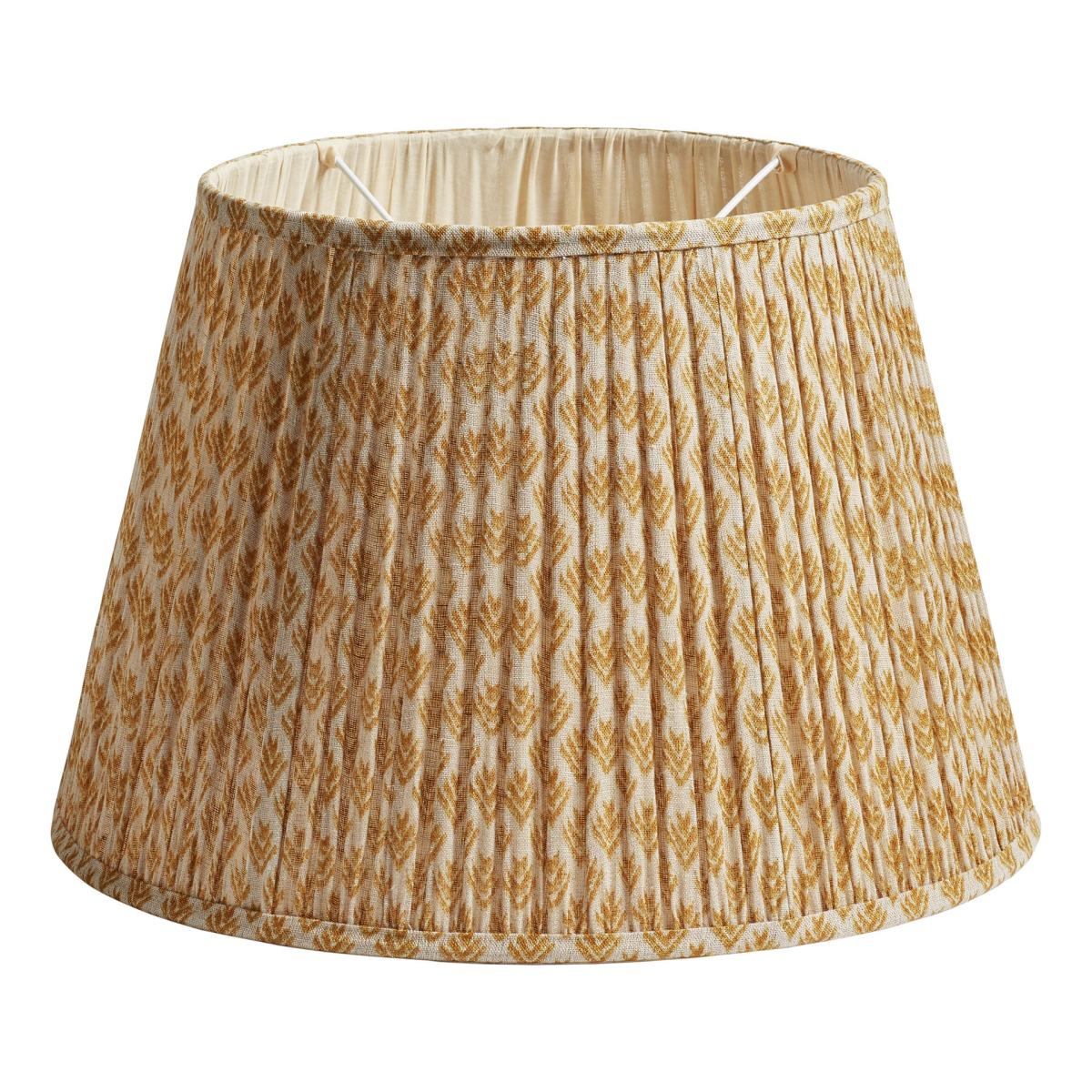 Our Hirkani Range of cushions and lampshades is named for the small diamond motifs used to adorn them. Inspired by Punjabi Phulkari patterns, our lampshades feature a modern take on the classic design, digitally printed onto a linen voile that is gathered by hand and pleated onto a metal frame. This version is the larger of our warm mustard-yellow lampshades. Please note: colour tones will vary from piece to piece.
