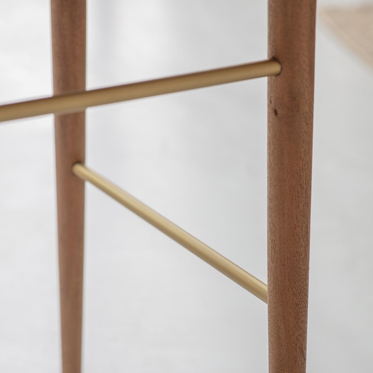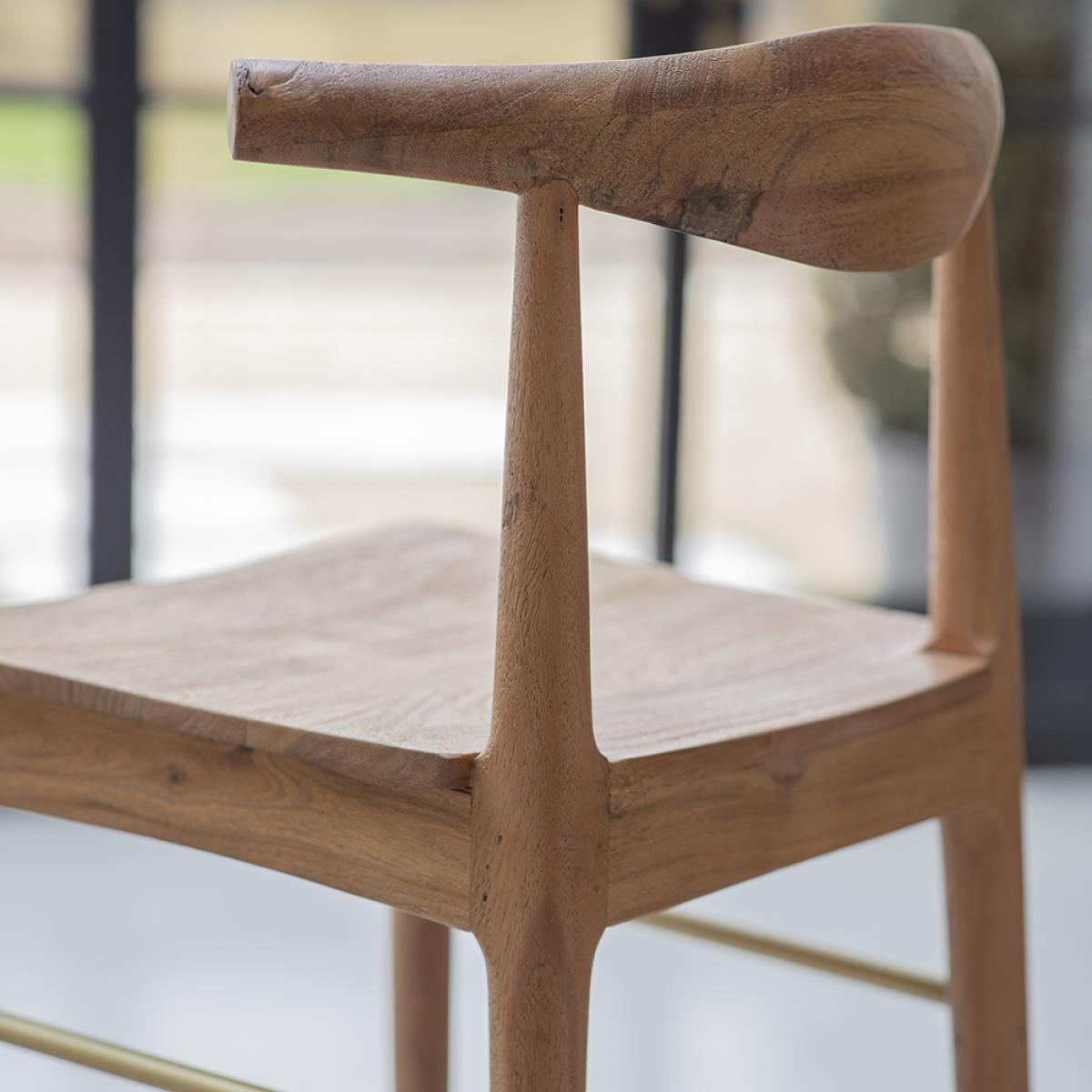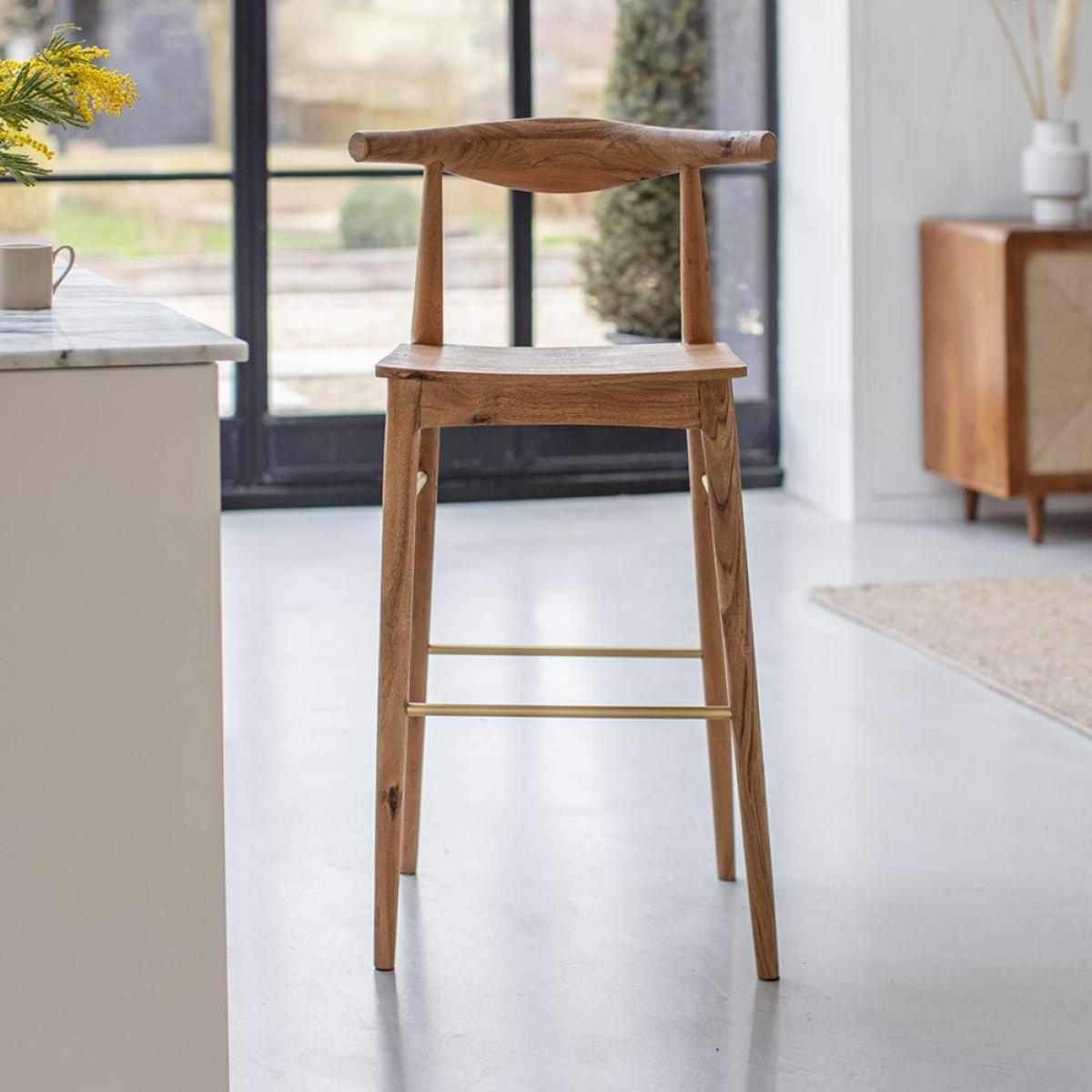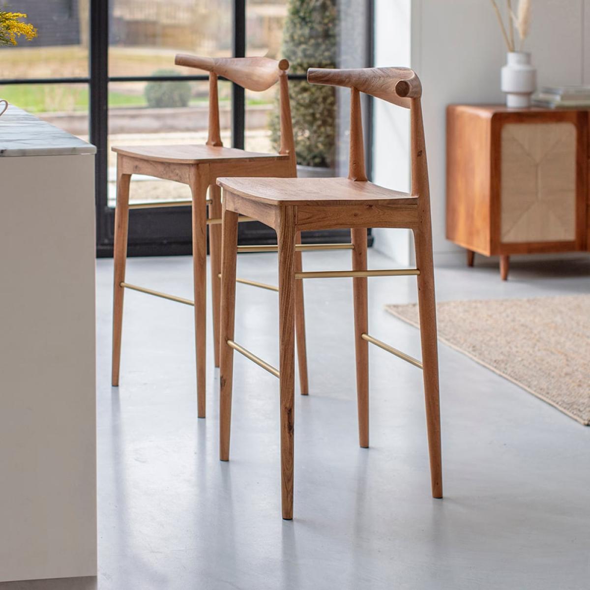 A design-led solid wood barstool inspired by timeless Japanese craftsmanship, our Hiro Barstool celebrates minimalist curves and natural materials. Available in Natural or Black, the stool has a softly curved back for support while the generously sized seat is ergonomically comfortable. This classic designer shaped stool has a minimalist shape that brings understated luxury to a kitchen island or breakfast bar with its brass detail rungs to the base, while the wire brushed wood finish draws out the natural wood grains. Use in the same room as our Cone Dining Table and Hiro Dining Chair for a sophisticated, co-ordinated look.