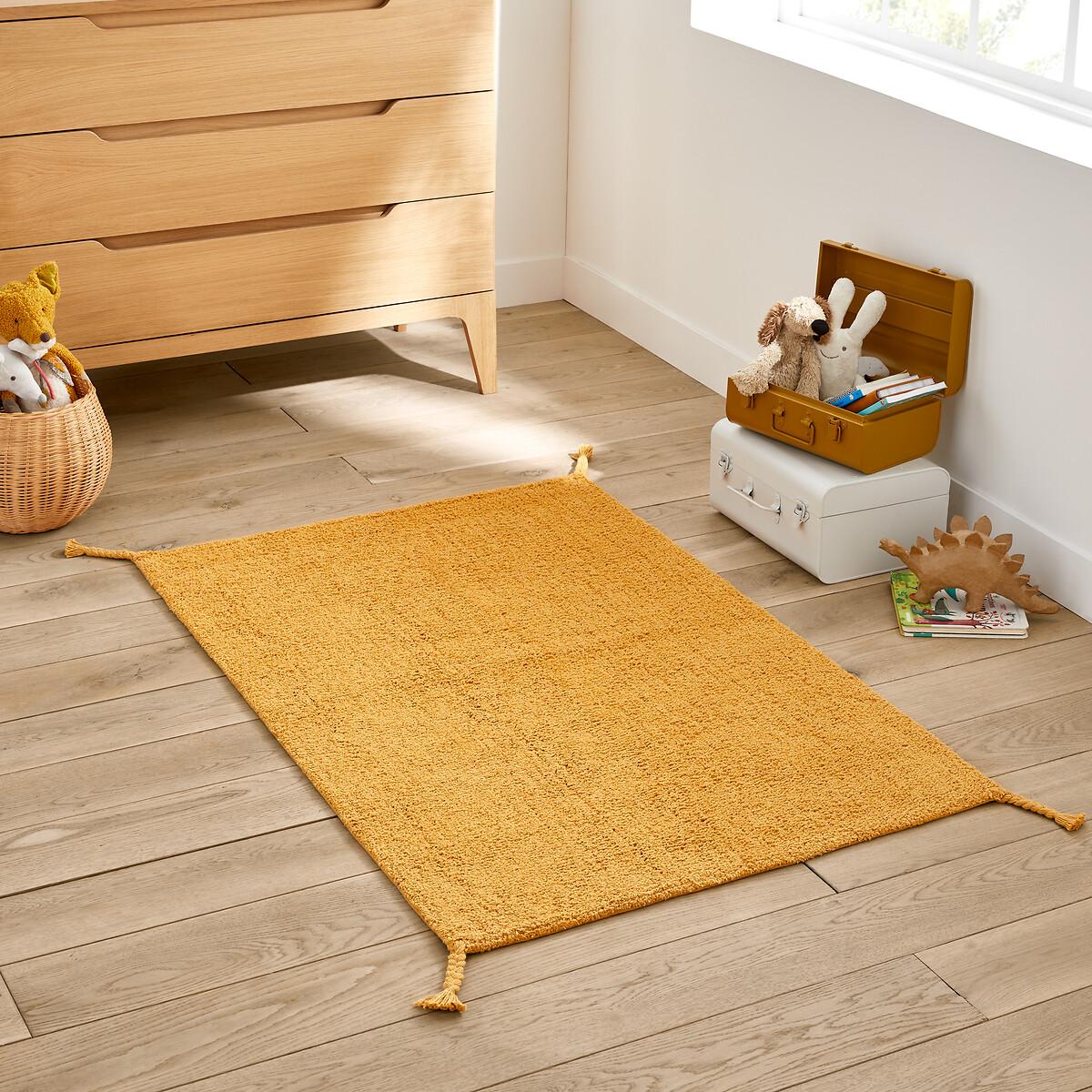 With tassels on the 4 corners, the Hiro children's rug will find its place in a child's room and will create a warm atmosphere.. Made from cotton and handmade, it insulates from the cold and provides comfort and softness. Product Details • 100% cotton, 1700 g/m2 • Artisanal craftsmanship • Tassel on each corner • Machine washable • Non-slip backing. Quality Info • Cotton is soft to the touch and fluffy. This cotton rug is a good heat and sound insulator. Sizes • Width 80 x Length 130cm • Thickness: 1.7cmDelivery:. Available for home delivery.