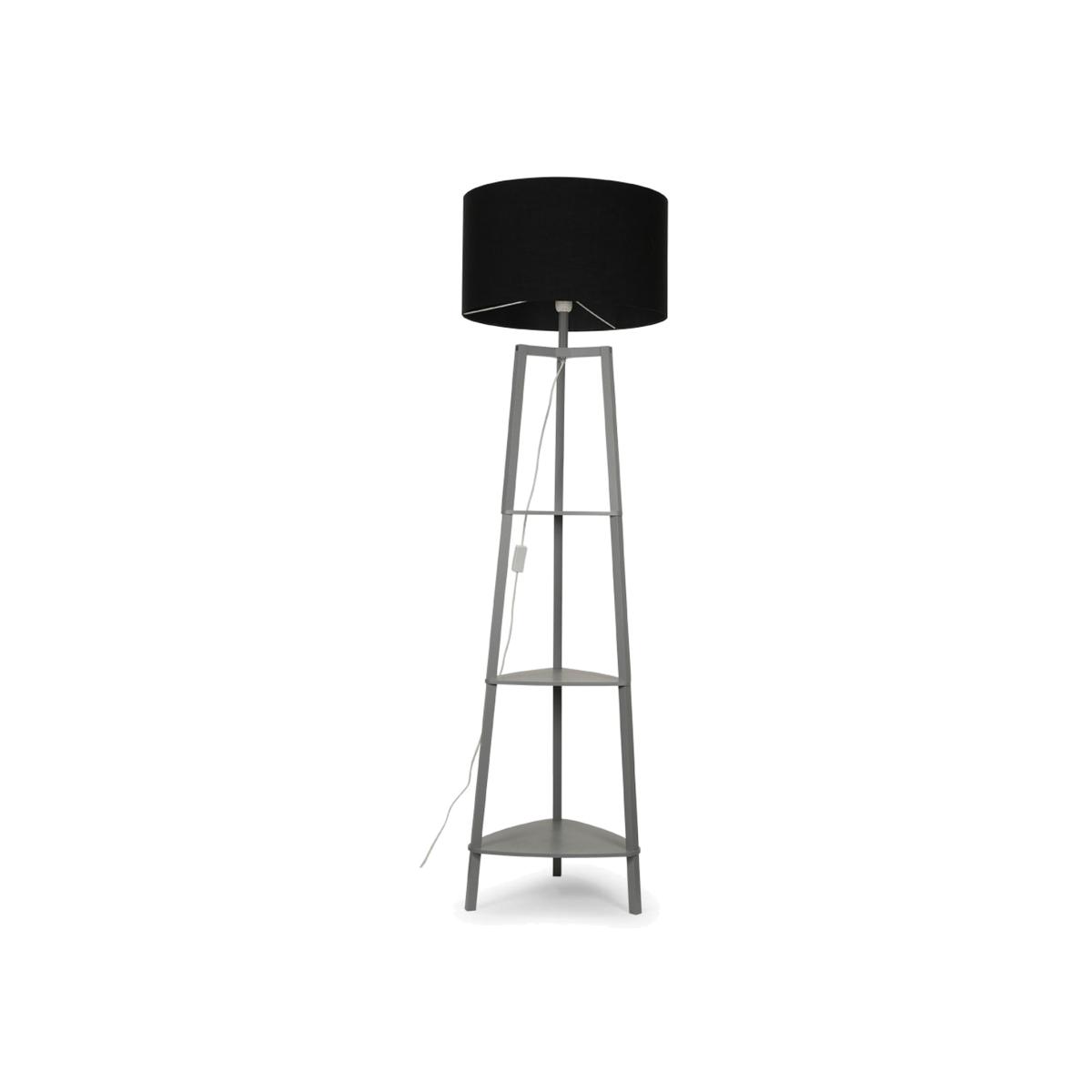 Contemporary floor lamp base in a grey wooden finish. This unique floor lamp is complete with 3 shelves for storage and display of personal items. Comes complete with a black cylinder drum fabric shade which emits a warm, ambient glow to your desired space. Its style matches perfectly with most interior decors. Ideal for lounges, hallways, bedrooms and other living areas. Please note: This product requires self-assembly.
