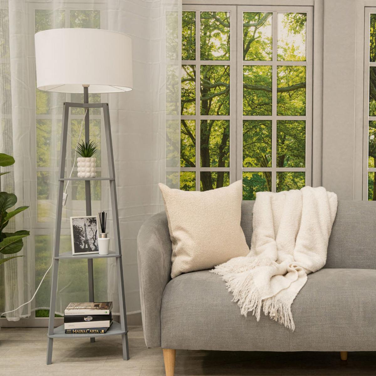 Contemporary floor lamp base in a grey wooden finish. This unique floor lamp is complete with 3 shelves for storage and display of personal items. Comes complete with a white cylinder drum fabric shade which emits a warm, ambient glow to your desired space. Its style matches perfectly with most interior decors. Ideal for lounges, hallways, bedrooms and other living areas. Please note: This product requires self-assembly.