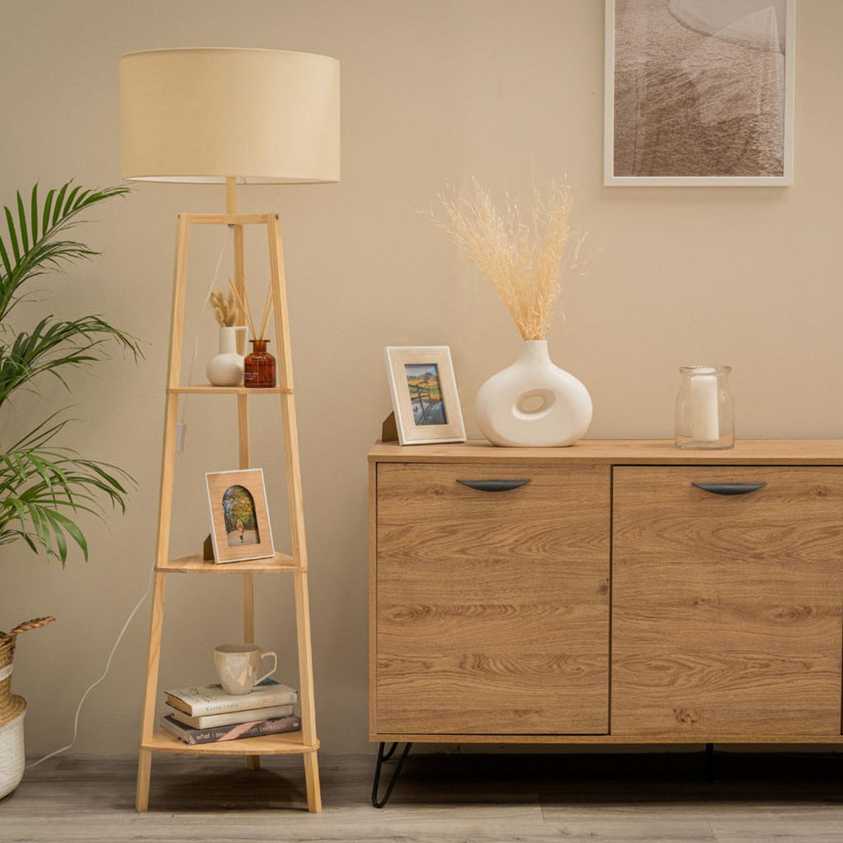 Contemporary floor lamp base in a natural wooden finish. This unique floor lamp is complete with 3 shelves for storage and display of personal items. Comes complete with a neutral cylinder drum fabric shade which emits a warm, ambient glow to your desired space. Its style matches perfectly with most interior decors. Ideal for lounges, hallways, bedrooms and other living areas. Please note: This product requires self-assembly.