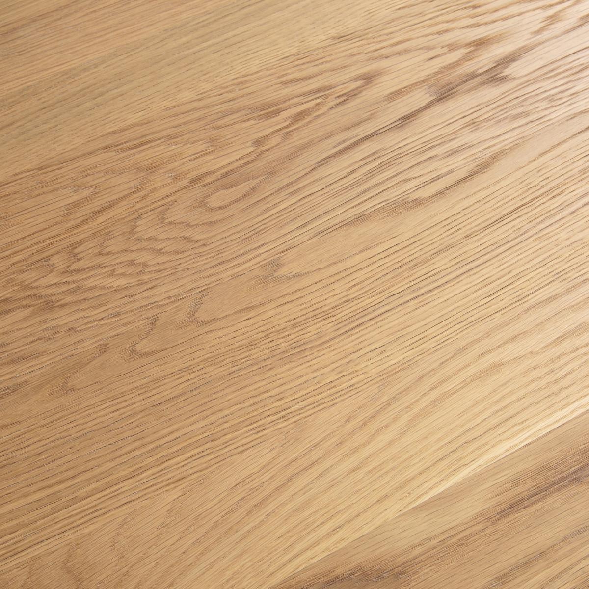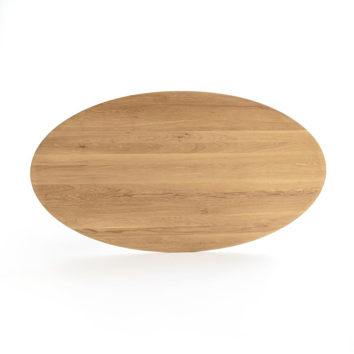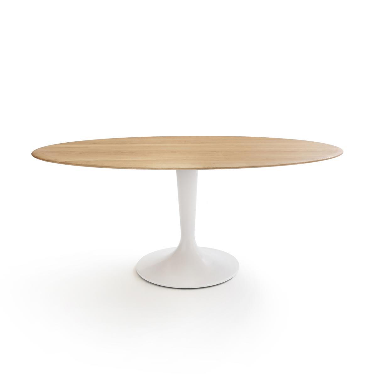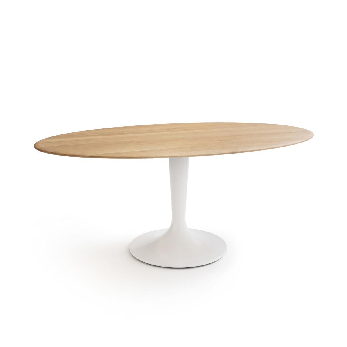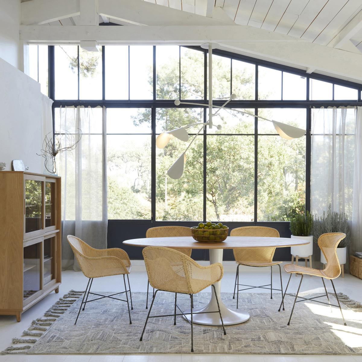 I love this table for its sleek, organic silhouette and the warmth of the solid oak top, which adds a touch of natural elegance to any dining space. It works particularly well in contemporary or Scandi-inspired interiors where clean lines and understated materials are key. The oval shape encourages conversation and creates a more intimate dining experience. For styling, consider pairing it with minimalist chairs in neutral tones or soft textures to highlight its simplicity. An understated centrepiece or a few modern tableware pieces can complete the look without overwhelming the natural beauty of the wood. Practical tip: given its solid oak construction, regular treatment with oil will keep it looking fresh and alert to spills with a quick wipe-perfect for everyday use.