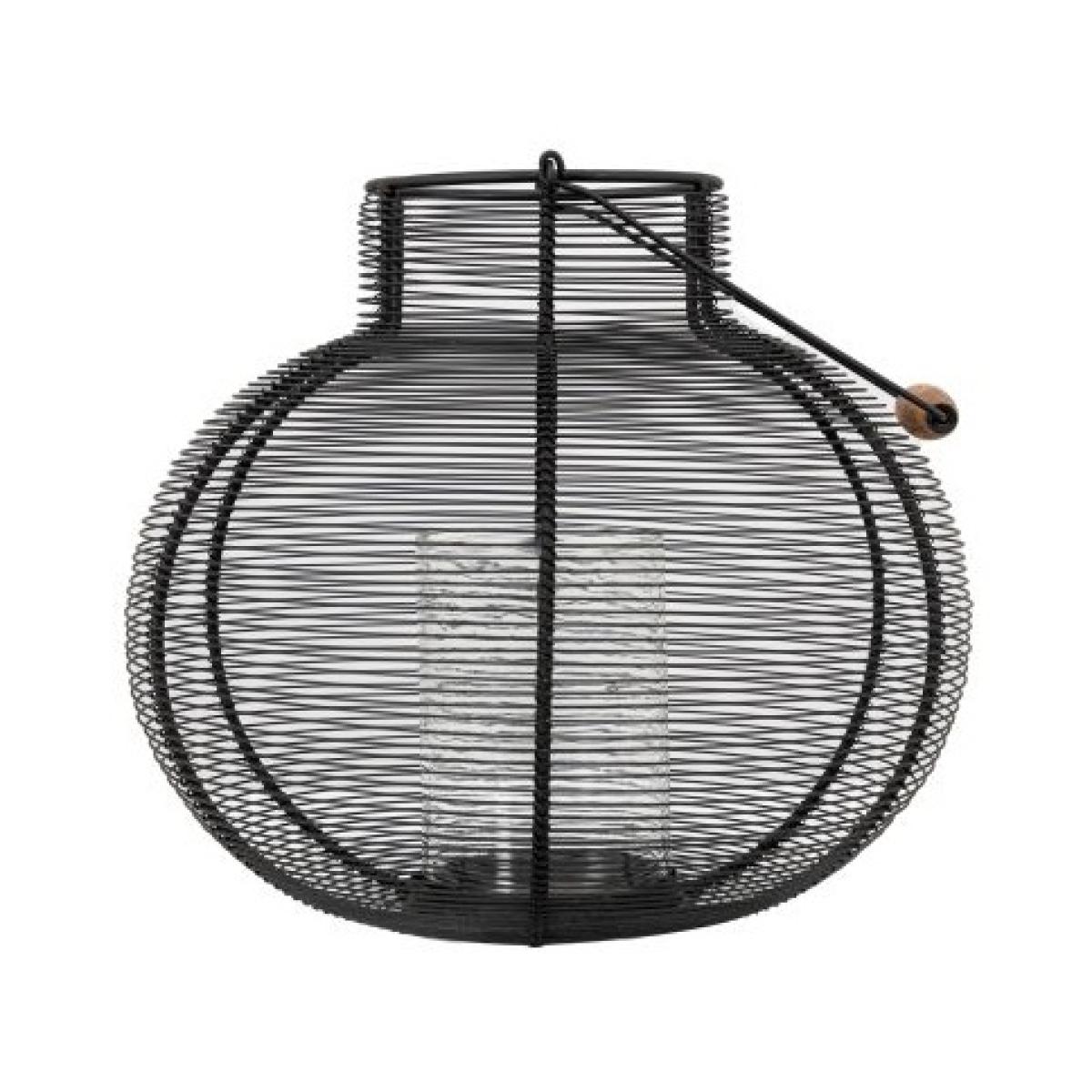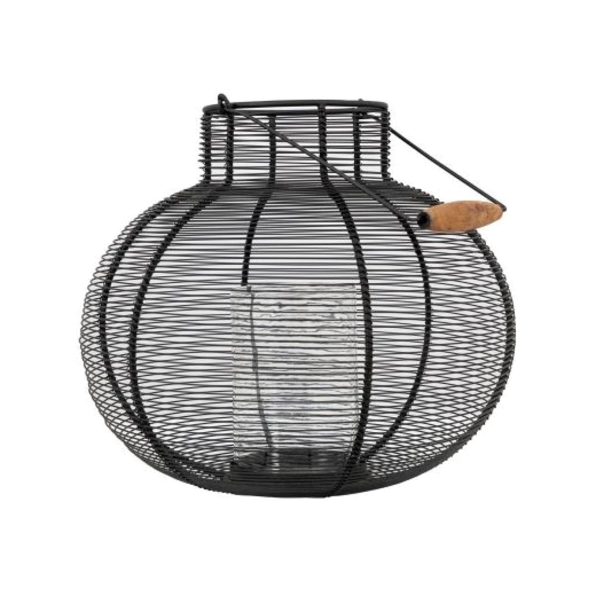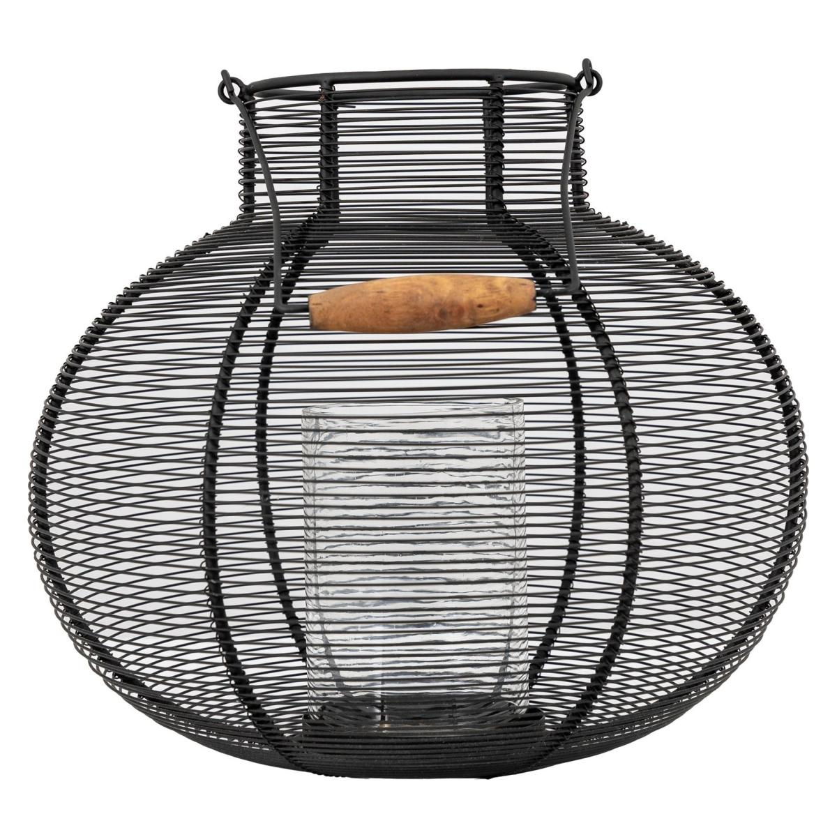 Crafted from woven wire, this lantern adds a warm ambience to your space. The rounded black woven wire basket has a fluted top and wooden basket handle. 2 sizes available. Candles not included. Colour - Black Material - Iron / Glass Size - W 350 x D 340 x H 285mm