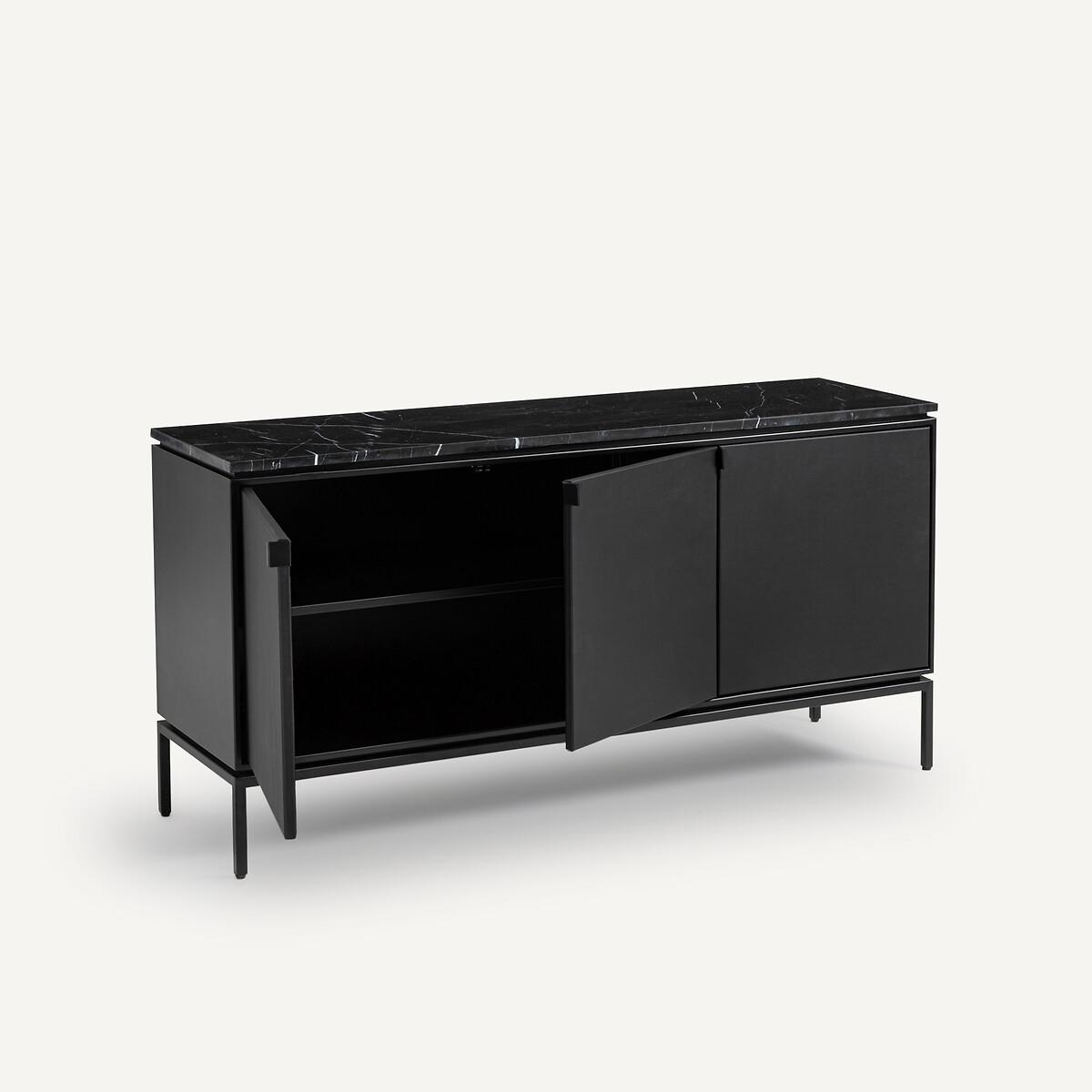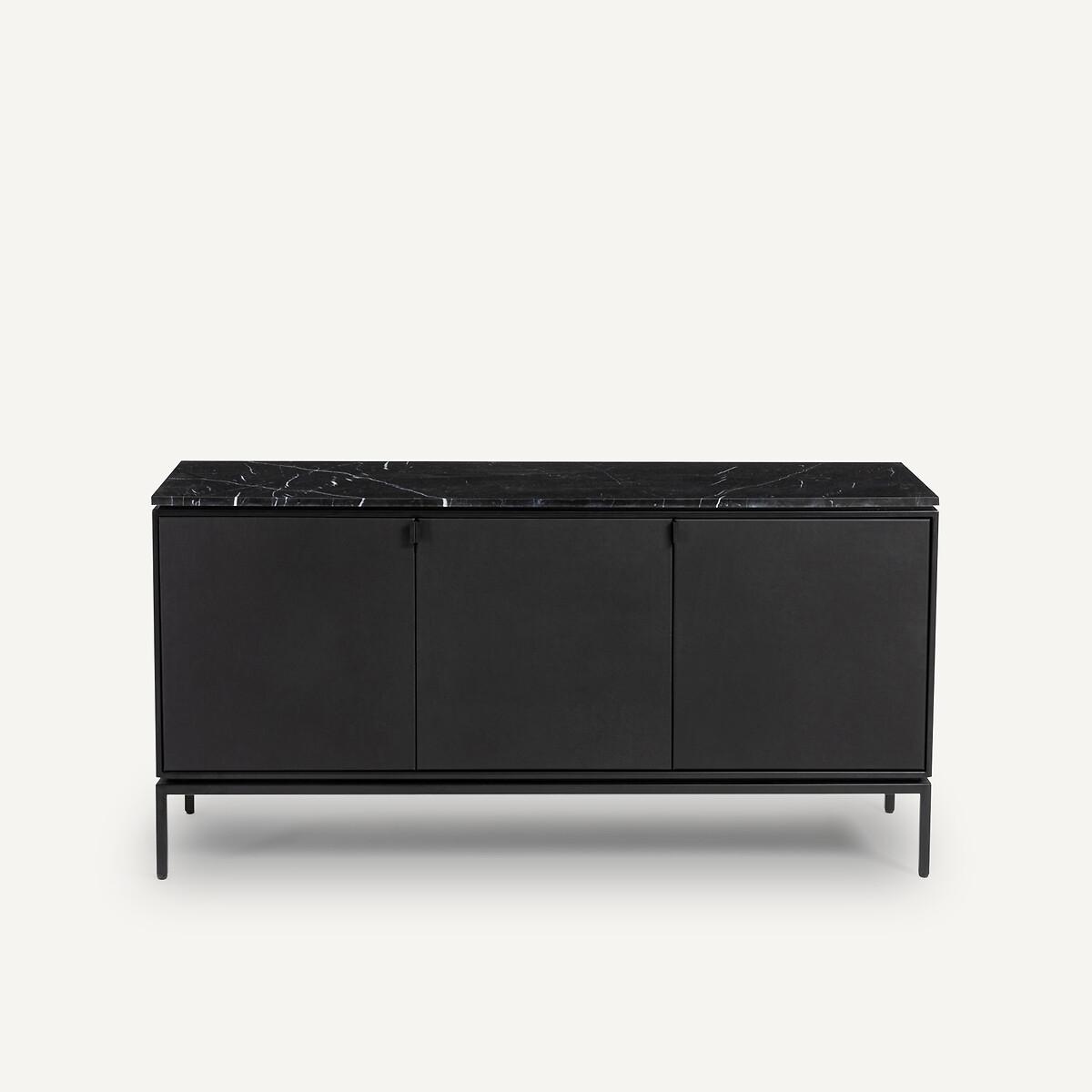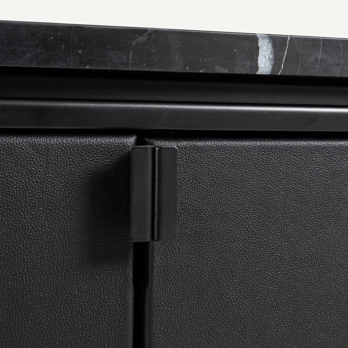 Marble top, sleek metal base, fronts covered in genuine Italian leather... The Hitha sideboard has a particularly sophisticated design. Classic materials and a slender line. An exclusive creation by AMPM.Product Details • Black marble top: each piece is unique, the marbling can be more or less marked • Metal frame with epoxy finish • Door fronts in metal covered with genuine Italian leather (cowhide, full grain, aniline finish, chrome tanning) • 3 doors with soft closing system* • Doors opening onto 3 removable and height-adjustable shelves. Quality Info • This furniture is equipped with German brand hardware: reliable, discreet and functional. These accessories ensure the longevity of your product. Care Advice. Marble is a naturally porous material that is sensitive to stains. To keep it in optimum condition, follow the maintenance tips below: • Avoid placing hot objects on the surface, use coasters and trivets. • Immediately wipe up any spilled liquid with a white cloth dipped in lukewarm water and wrung out. • Maintain your marble regularly with products from our partner Akemi® • We advise you to use Akemi® Crystal Clean Spray for your daily maintenance and, at least once a month, Akemi® Triple Effect Spray to clean and protect your marble surface.. This will reinforce the initial treatment and its water-repellent effect will prevent dirt from easily penetrating the stone.. • If you want to use products other than those of our partner Akemi®, choose only p. H-neutral cleaners. • Acid, anti-limescale or bleach-based products are not recommended. Dimensions Overall • Width: 140cm • Height: 70cm • Depth: 41cm • Base height: 16cm. Usable dimensions • Compartment behind double doors (without shelves):L90 x H46 x D36cm • Compartment behind right hand door (without shelf): L42 x H46 x D36cmDelivery:. Sold pre-assembled. Available for home delivery. Note! Please check that all access points are large enough to accommodate your delivery (doors, stairs, lifts). Dimensions and weight of parcel2 parcels • L151 x H52 x D80cm. 80kg • L151 X H13 x D52cm. 45kg