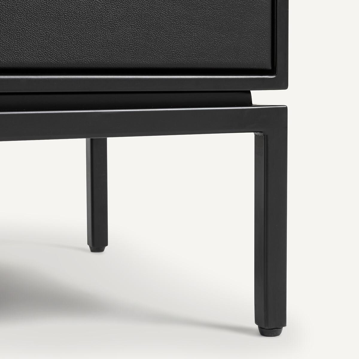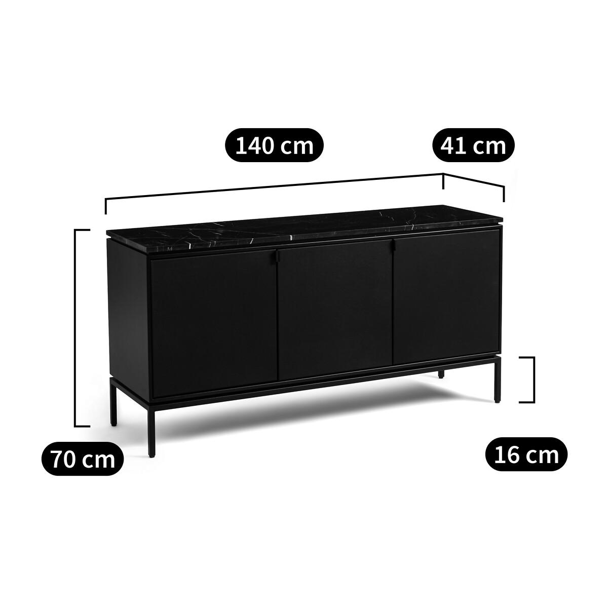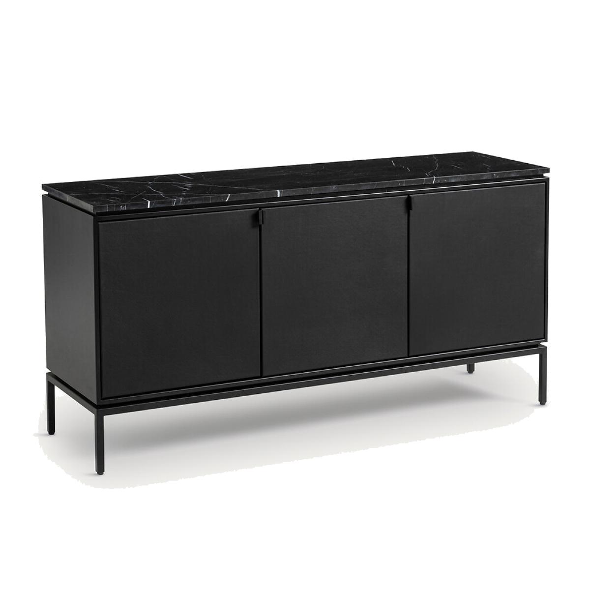 Marble top, sleek metal base, fronts covered in genuine Italian leather... The Hitha sideboard has a particularly sophisticated design. Classic materials and a slender line. An exclusive creation by AMPM.Product Details • Black marble top: each piece is unique, the marbling can be more or less marked • Metal frame with epoxy finish • Door fronts in metal covered with genuine Italian leather (cowhide, full grain, aniline finish, chrome tanning) • 3 doors with soft closing system* • Doors opening onto 3 removable and height-adjustable shelves. Quality Info • This furniture is equipped with German brand hardware: reliable, discreet and functional. These accessories ensure the longevity of your product. Care Advice. Marble is a naturally porous material that is sensitive to stains. To keep it in optimum condition, follow the maintenance tips below: • Avoid placing hot objects on the surface, use coasters and trivets. • Immediately wipe up any spilled liquid with a white cloth dipped in lukewarm water and wrung out. • Maintain your marble regularly with products from our partner Akemi® • We advise you to use Akemi® Crystal Clean Spray for your daily maintenance and, at least once a month, Akemi® Triple Effect Spray to clean and protect your marble surface.. This will reinforce the initial treatment and its water-repellent effect will prevent dirt from easily penetrating the stone.. • If you want to use products other than those of our partner Akemi®, choose only p. H-neutral cleaners. • Acid, anti-limescale or bleach-based products are not recommended. Dimensions Overall • Width: 140cm • Height: 70cm • Depth: 41cm • Base height: 16cm. Usable dimensions • Compartment behind double doors (without shelves):L90 x H46 x D36cm • Compartment behind right hand door (without shelf): L42 x H46 x D36cmDelivery:. Sold pre-assembled. Available for home delivery. Note! Please check that all access points are large enough to accommodate your delivery (doors, stairs, lifts). Dimensions and weight of parcel2 parcels • L151 x H52 x D80cm. 80kg • L151 X H13 x D52cm. 45kg