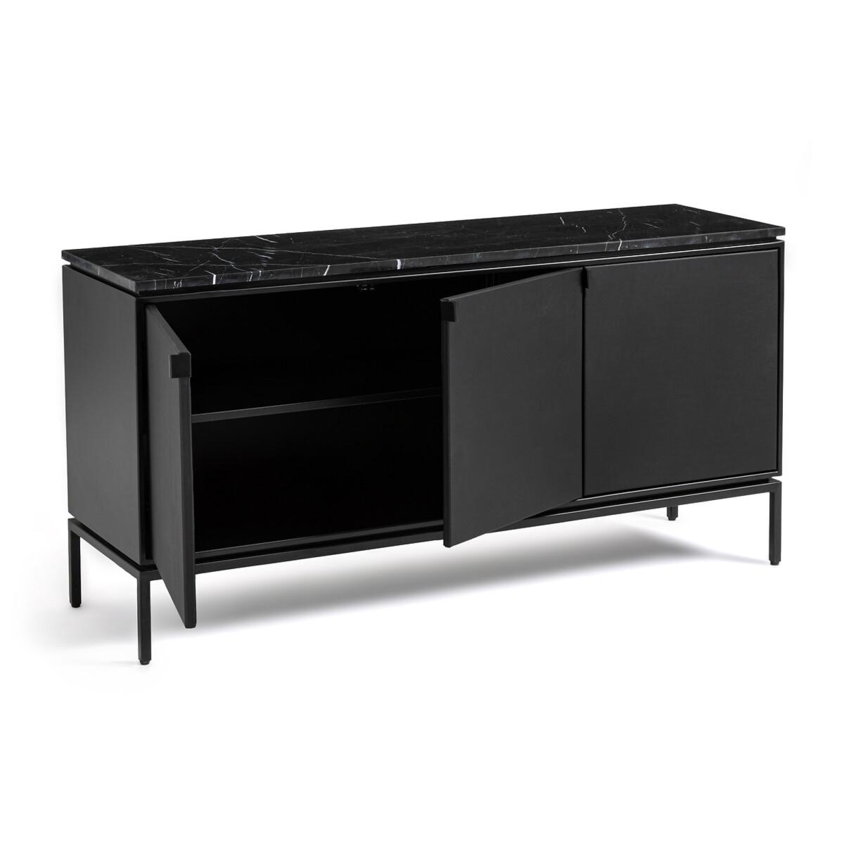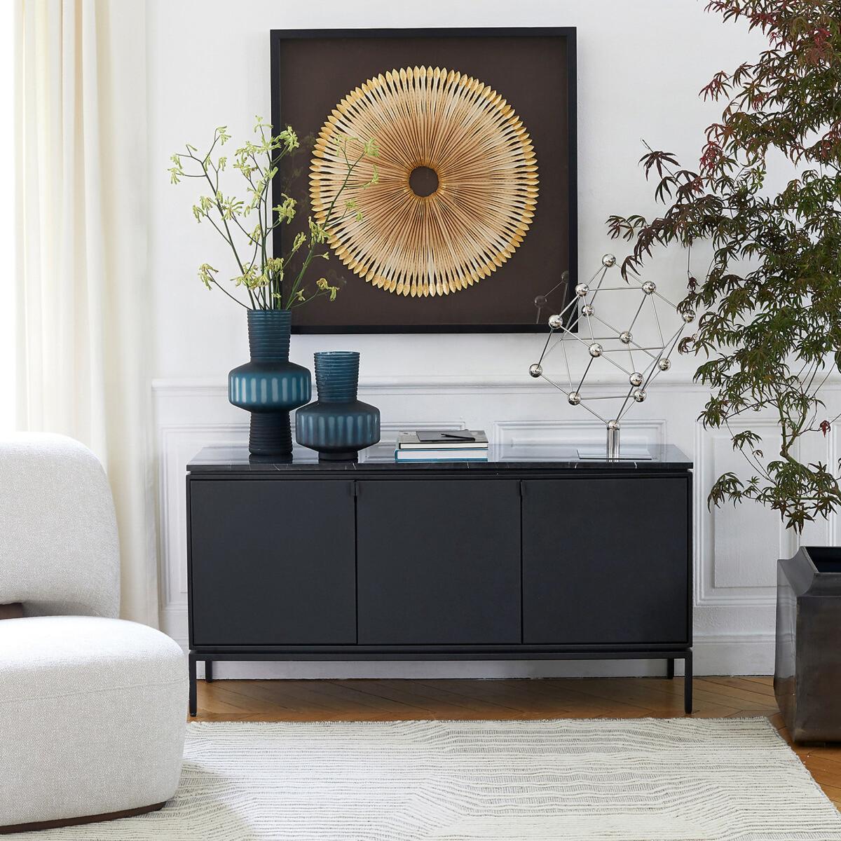 I love this sideboard for its sleek combination of marble and metal, which lends it a modern yet timeless appeal. It works particularly well in contemporary or minimalist interiors, where its clean lines and monochromatic palette can make a bold statement. Practical styling tips include using it as a media unit or a statement storage piece in dining or living areas. Decorate the top with sculptural objects, statement lamps, or a tray for organising essentials, while the interior provides ample space for tableware or linens. To keep the look cohesive, pair it with other black metal accents or light woods to create a balanced, curated space.