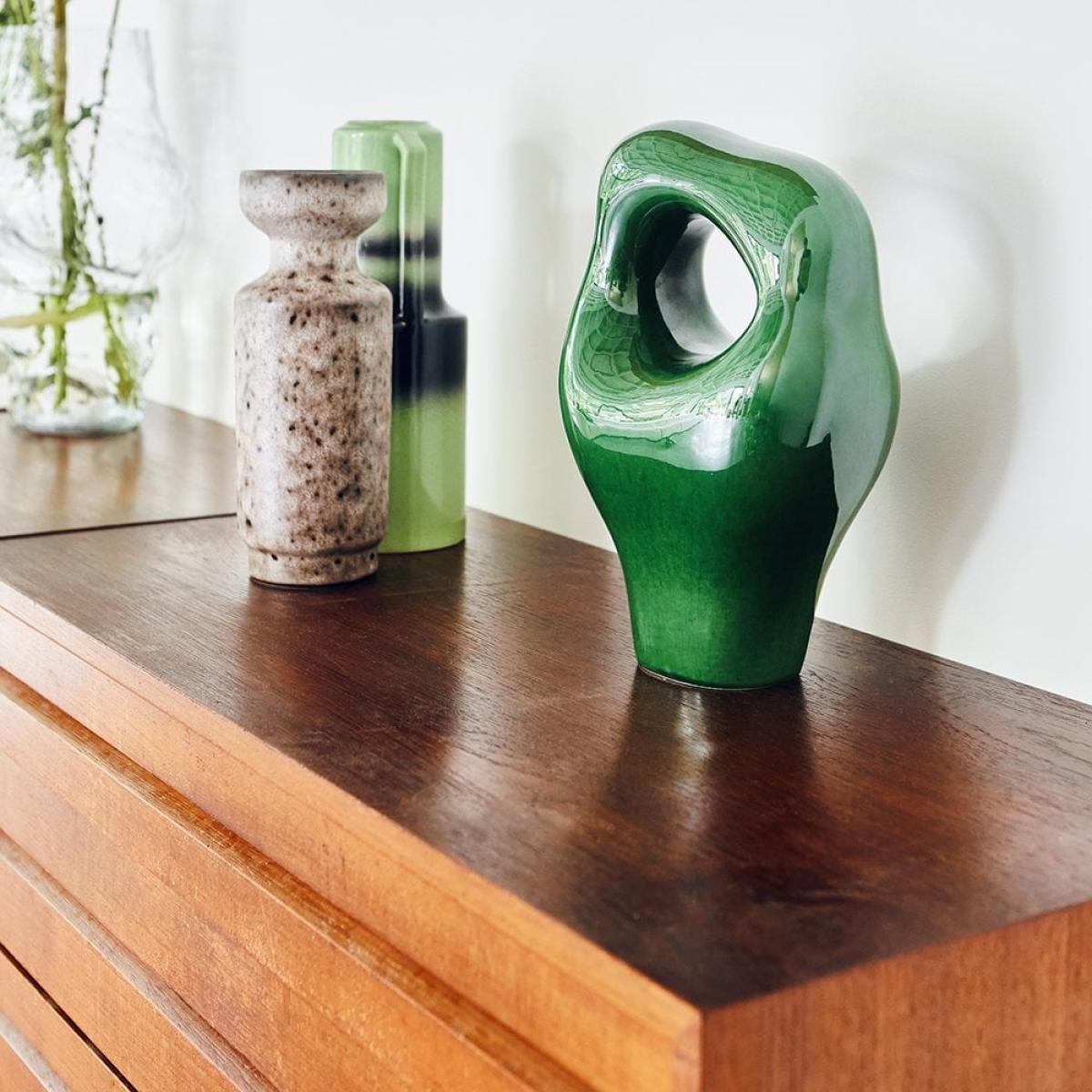 I love this glossy green ceramic sculpture for its bold colour and contemporary form, which makes it an eye-catching statement piece. It works particularly well in minimalist or modern interiors, where its sculptural shape can be appreciated fully without competing with other decor. For styling tips, place it on a neutral sideboard, console or open shelving to let the colour and shape stand out. Pairing it with natural textures - like wood or woven baskets - can add warmth, while grouping it with smaller, contrasting sculptures can create an engaging visual display. Its versatile size also means it works well as a centrepiece or in a curated vignette, adding a pop of colour and a touch of sculpture for an effortless update.