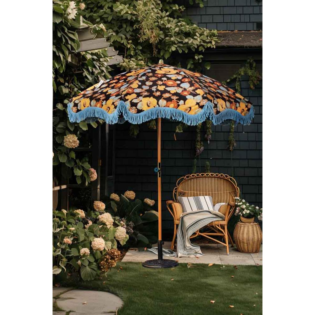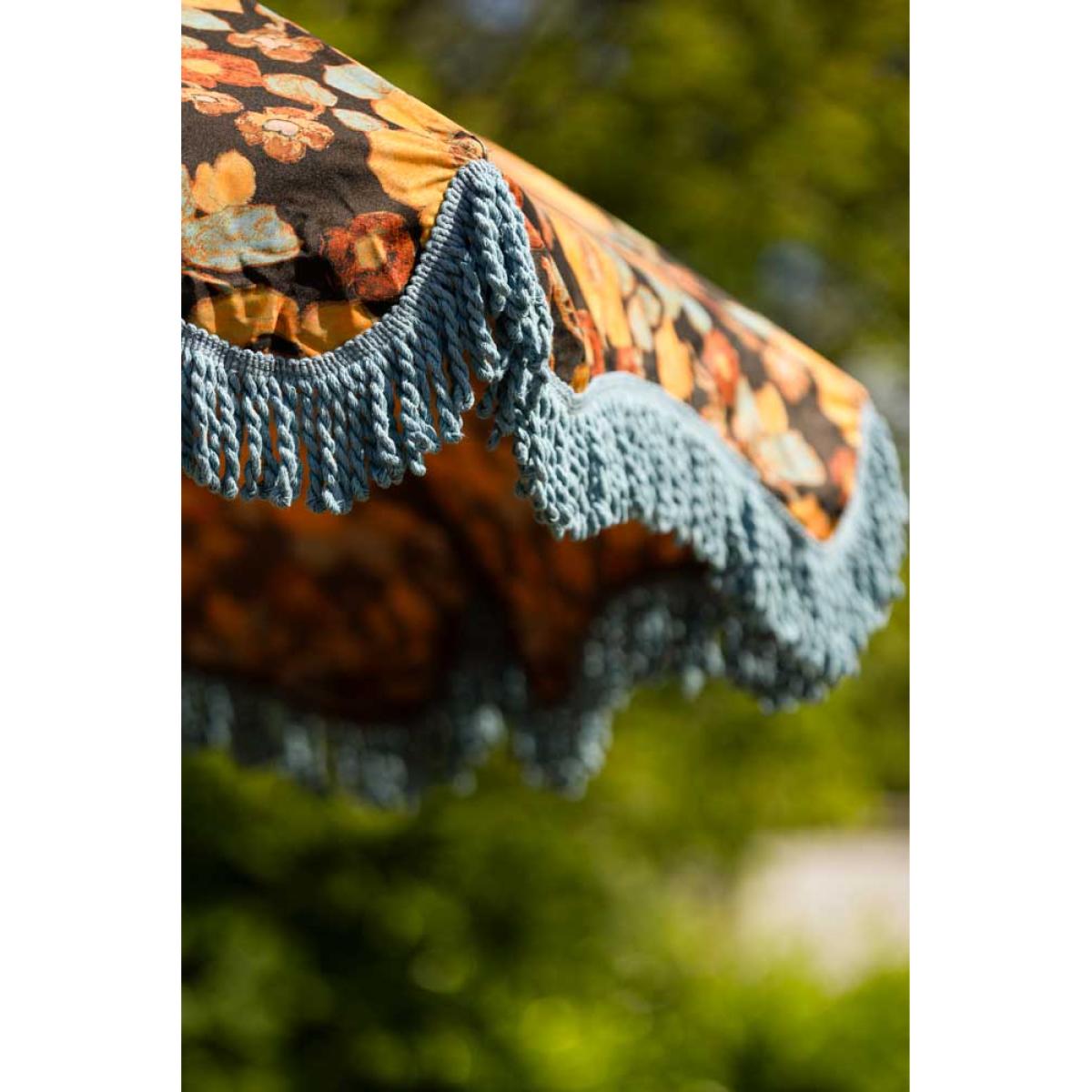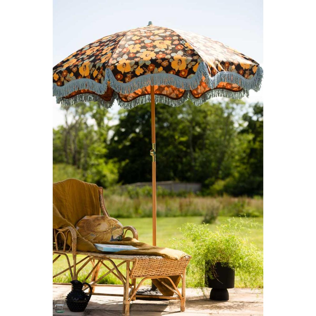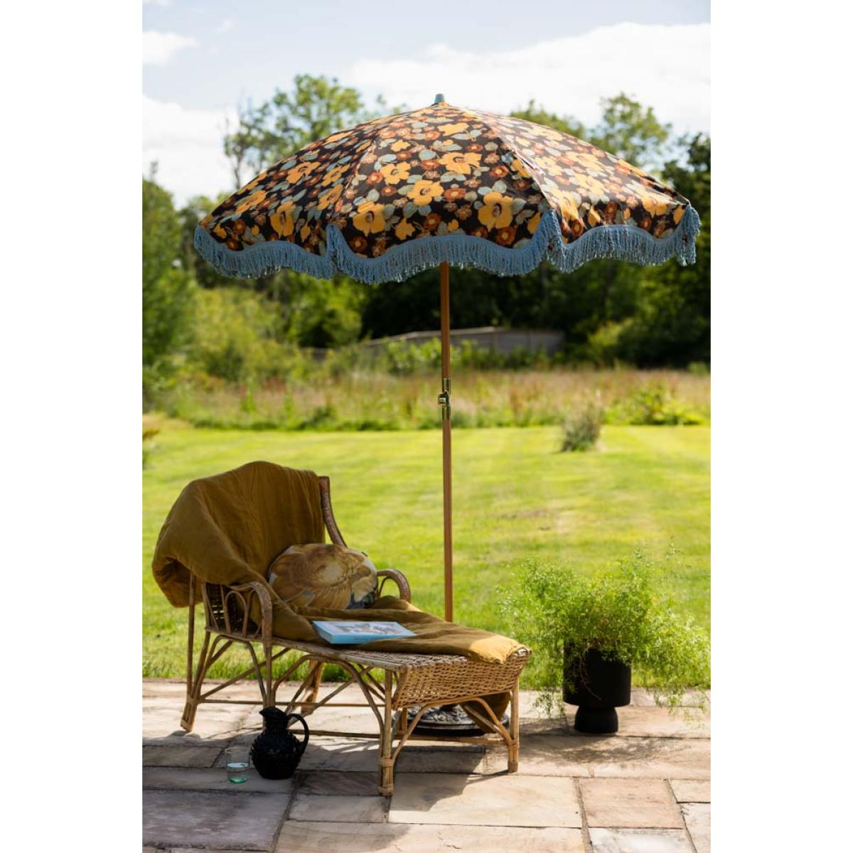 Create an outdoor haven of peace and tranquillity with this fabulous parasol – or at the very least, fashion a shady spot to which you can retreat when the mercury starts to rise. This beautiful garden brolly sports a combination of ‘70s colours that are brought bang up to date with the addition of ocean blue fringing, which adds a soft and tactile appeal to this garden essential. A sturdy, adjustable beechwood pole keeps the whole thing aloft, while a hardwearing polyester canopy supported by stainless steel ribs provides a glorious pool of cool under which you can enjoy your picnic or lunchtime spread. A quality piece with timeless appeal, this is an investment buy that will see you through many a season – when not in use, it folds down and slips neatly into its very own carry bag of the same design. Simply store away over winter ready for next year – an annual treat upon which to feast your eyes. - HKliving Floral Flourish Parasol with Blue Fringing - Material: Polyester, beechwood, brushed steel - Measures: H230cm x Dia. 200cm- Please note a stand is not included- Dry completely before storing- Colour may fade over time