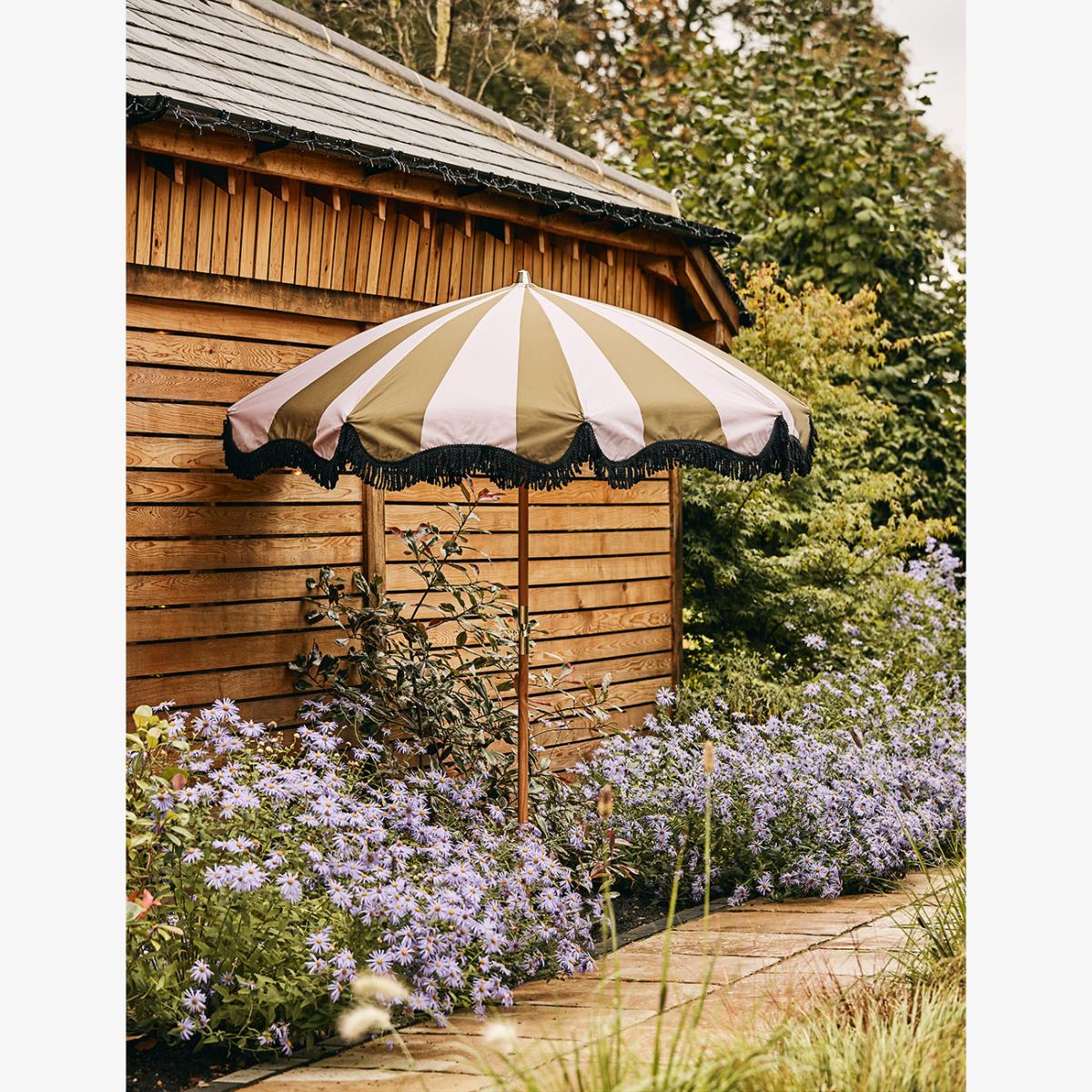 I love this parasol for its playful yet sophisticated colour palette - the pink and khaki stripes add a touch of personality while remaining versatile enough for both traditional and contemporary outdoor spaces. It works particularly well in cottage gardens or boho-inspired patios, where its relaxed vibe complements natural materials and lush planting. For practical styling, consider pairing it with wicker furniture or rustic wooden tables to enhance its charm, and if you’re going for a layered look, introduce cushions and accessories in similar muted tones to keep everything cohesive. It’s a great piece to create a defined outdoor lounging area, providing both shade and a pop of colour that doesn’t overwhelm the overall design.