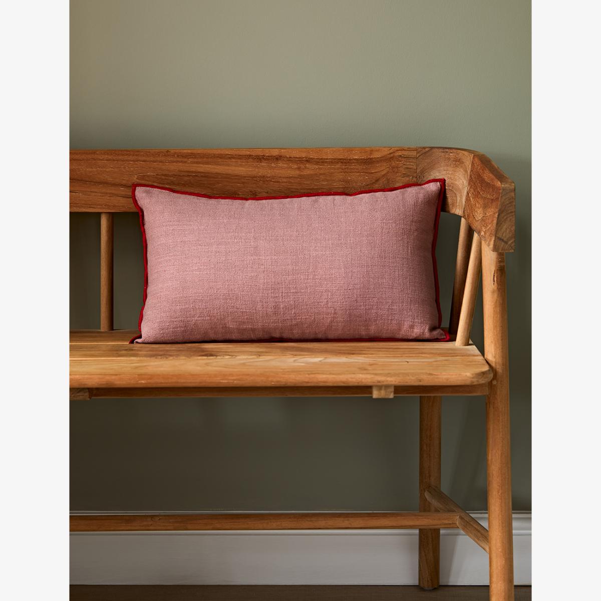 I love this pink cushion with red trim for its versatile pop of colour and subtle sophistication. It works really well in both contemporary and traditional interiors, adding warmth and a touch of playful contrast. Styling tip: pair it with neutral-toned sofas or armchairs to let the colour stand out, or mix with other pink and red accessories for a coordinated look. Its elongated shape makes it perfect for layering on a bed or sofa, creating a cosy yet polished look. Overall, it’s a practical addition that can elevate the colour scheme without overwhelming the space.