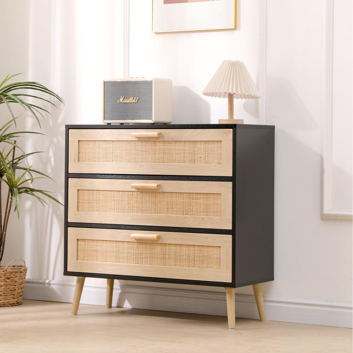 Discover the HMD elegant Rattan Dresser, a versatile storage cabinet featuring 3 Drawers. Crafted from durable particleboard, it showcases charming rattan weaving and sturdy wooden legs with protective anti-scratch pads. The stylish strip handles add a touch of modern flair. Ideal for organizing clothes, accessories, or decor, this chest of drawer also functions beautifully as a sideboard. Product dimensions: 80. L x 33W x 78. H cm