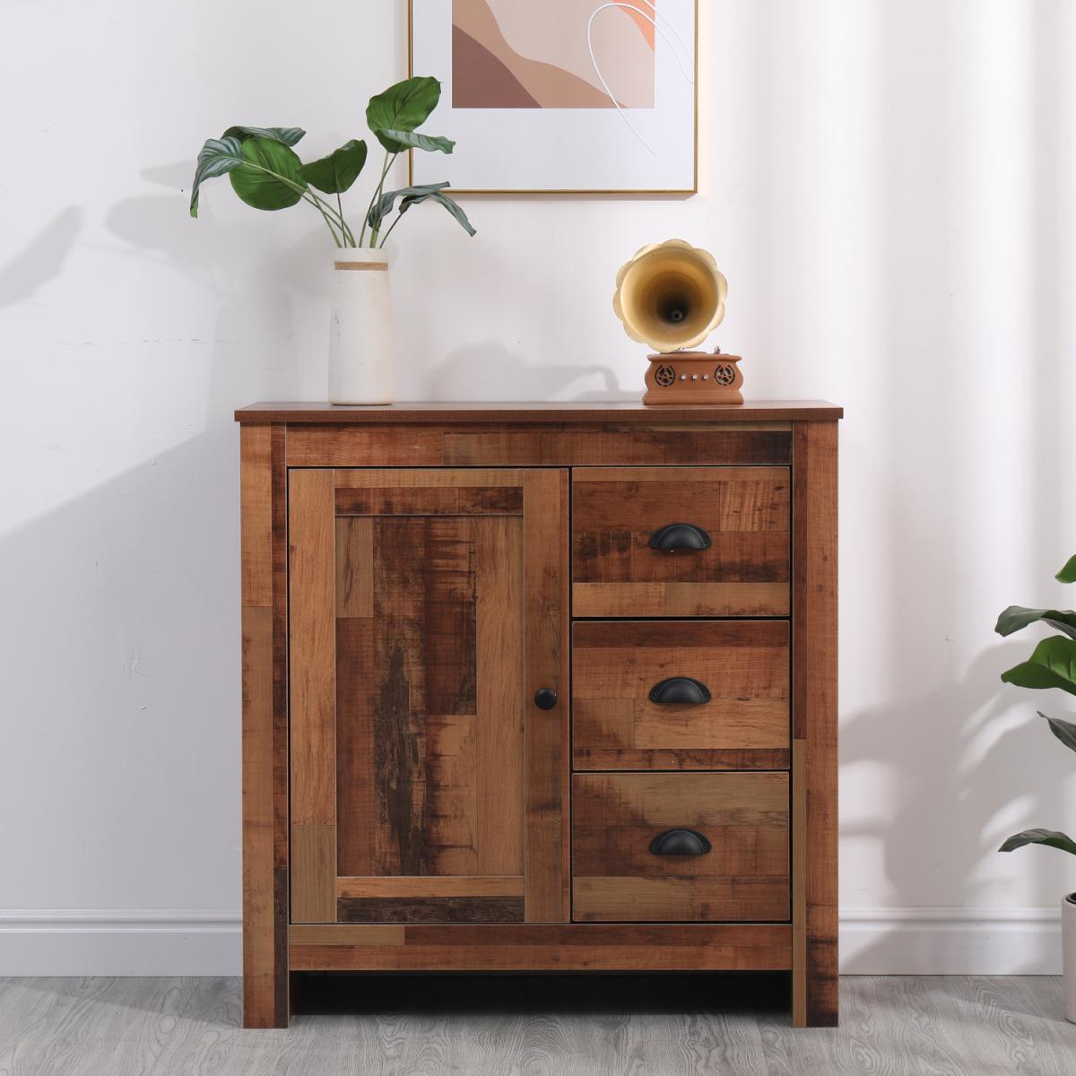 This HMD sideboard has three drawers and a door storage space to help you with household items. Divided into two levels of storage space behind the door, this storage unit's unique retro appearance reflects the unique style of the home. The chest of drawers is made of particleboard and has a stable structure, making it ideal for bedrooms, living rooms, kitchens, etc. Black metal handles add texture and this clothing storage cabinet is a great help to the family!
