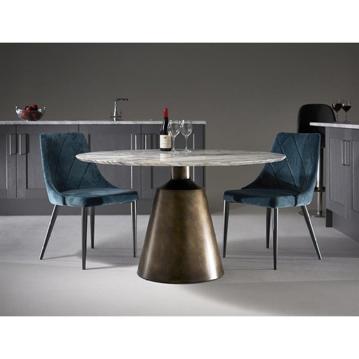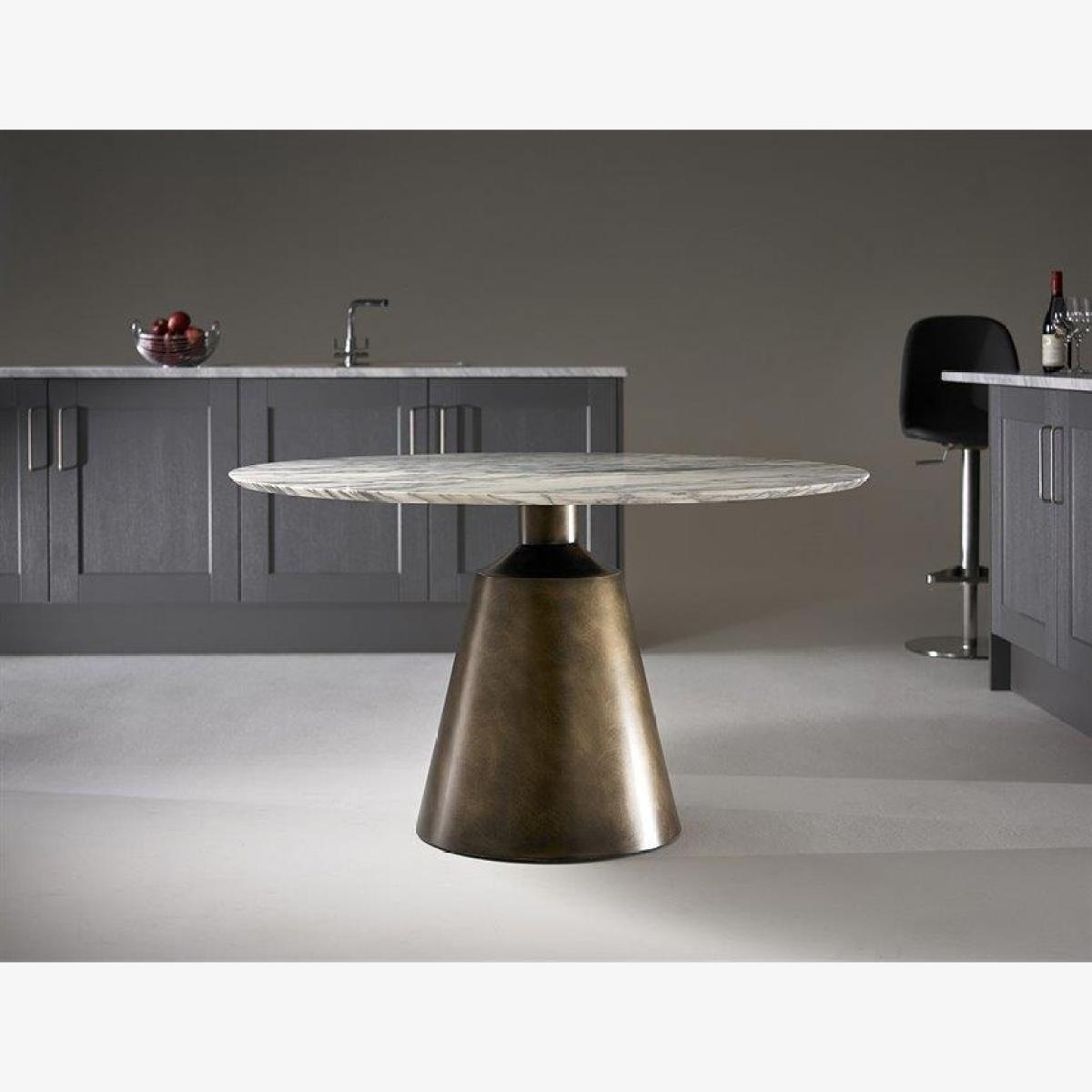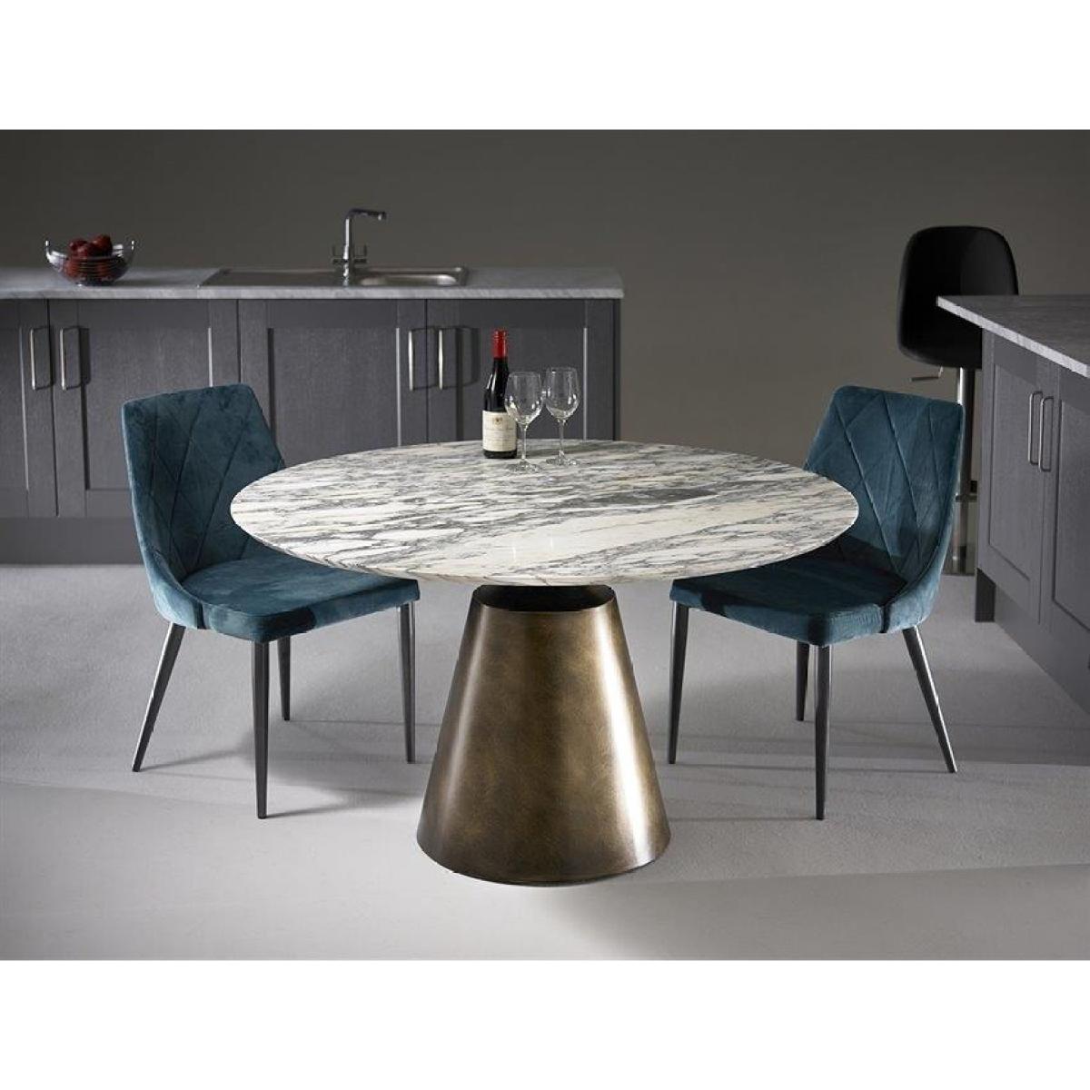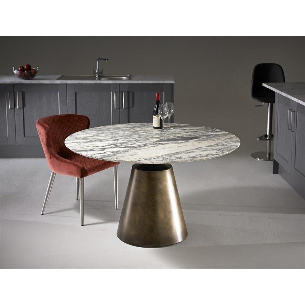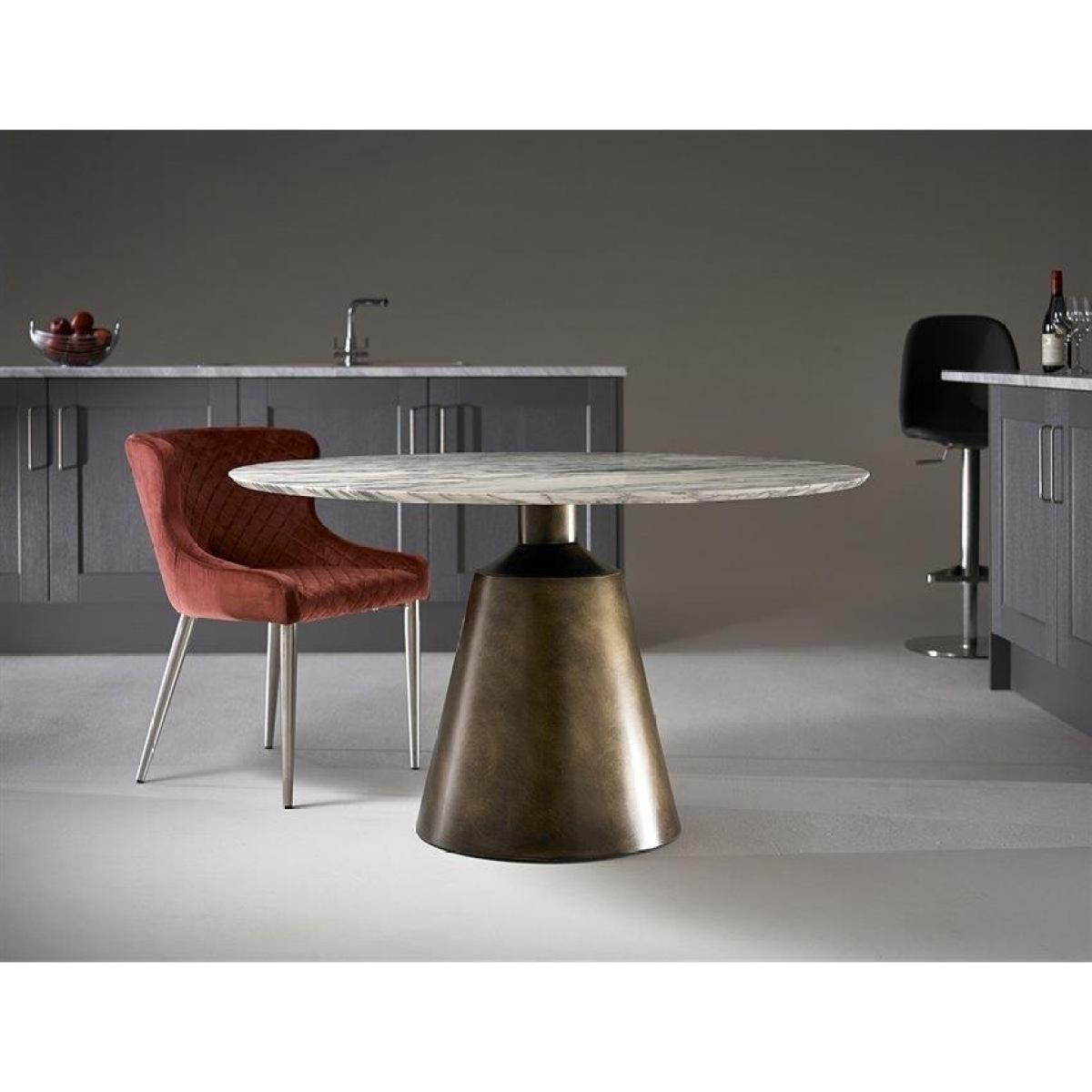I love this round dining table for its clean lines and versatile style, making it a great choice for a range of interiors. Its sleek marble top paired with the striking metallic base gives it a contemporary yet timeless appeal. It works particularly well in modern, minimalist, or industrial-style kitchens and dining spaces. For styling, consider pairing it with simple yet elegant chairs to maintain a cohesive look, and add a statement centrepiece or colourful placemats to introduce personality. It’s practical too - the round shape encourages social interaction, and the sturdy base provides stability, making it suitable for frequent use.