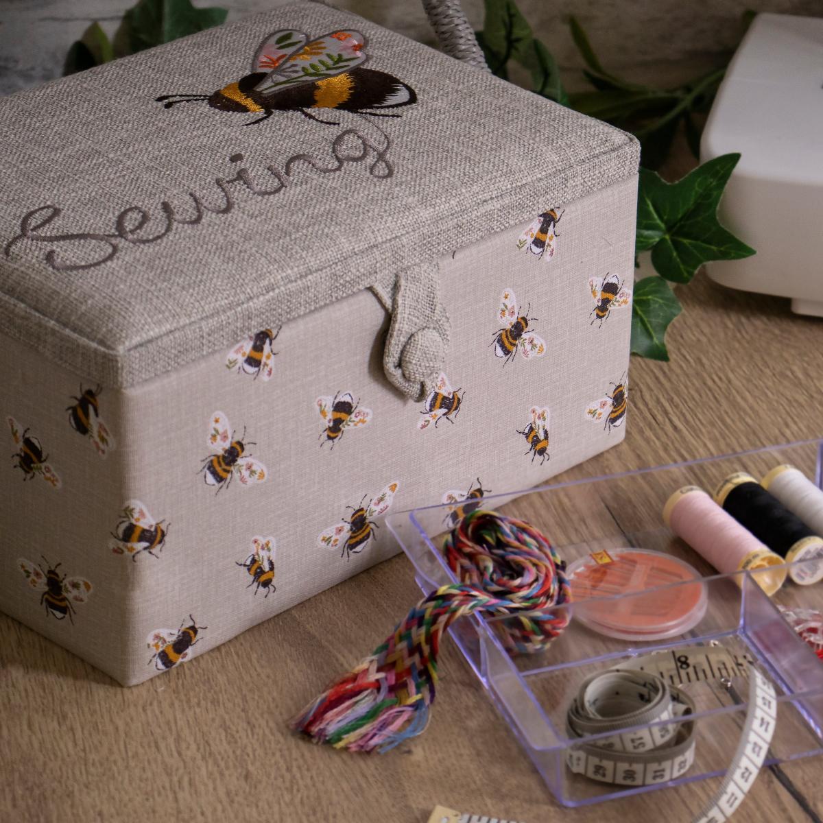 * Made from durable cotton fabric* Embroidered bee design* Includes compartments* Raffia-effect handle Stay organised and inspired with this cheerful sewing box! With its embroidered bee motif, raffia-effect handle, and internal compartments, it’s the perfect balance of charm and practicality. Keep your sewing essentials close and your creativity buzzing.