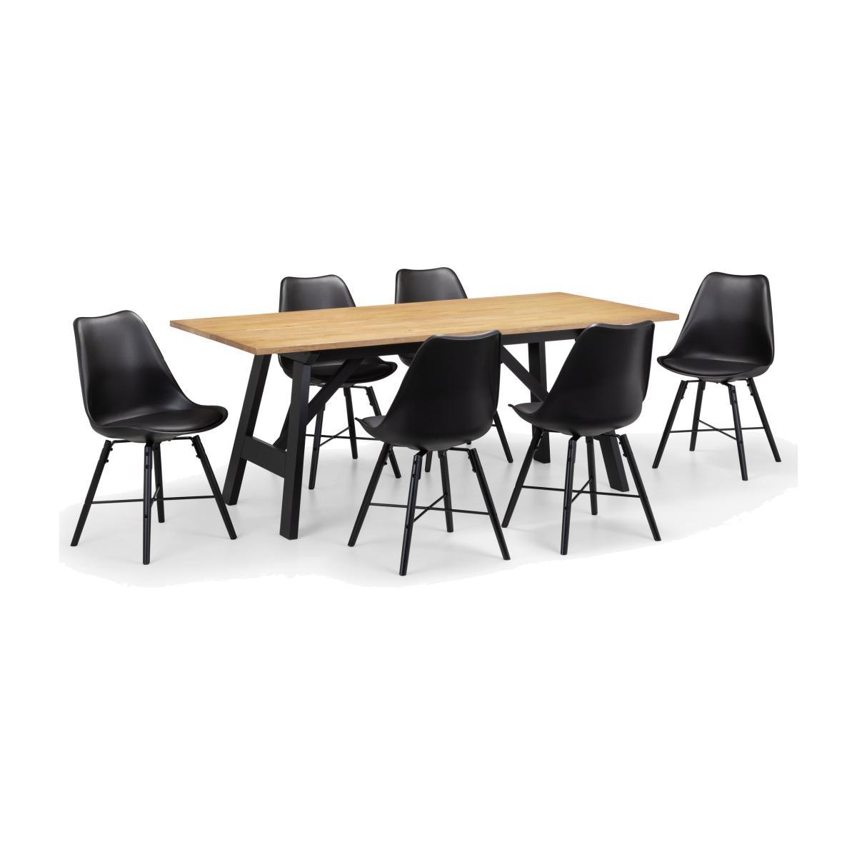 I love this dining set for its sleek, contemporary look and practicality. The combination of the natural wood table with its sturdy black base pairs beautifully with the Kari chairs, creating a chic yet versatile focal point for most interiors. It works particularly well in modern, Scandinavian, or industrial-inspired spaces, where clean lines and contrasting materials are key. For styling tips, consider adding textured textiles like a neutral runner or colourful placemats to soften the black chairs, and incorporate contrasting accessories such as metallic or ceramic decor to add visual interest. This set also lends itself well to both casual family meals and more sophisticated dinner parties, making it a practical choice for a busy, style-conscious home.
