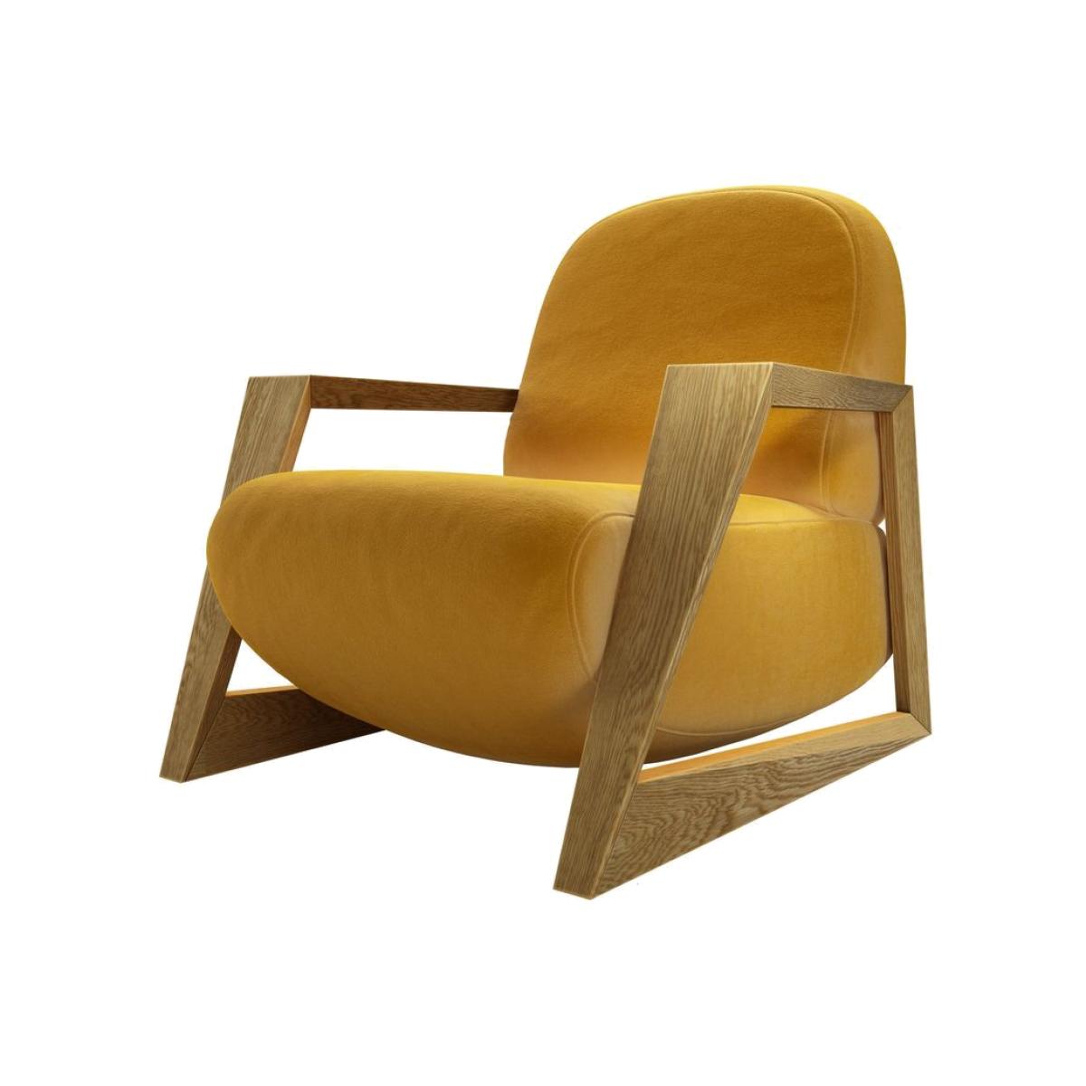 Taking a slice of inspiration from 1980's Danish design, our Hockney armchair is sure to introduce suave style into your home. Bring a touch of the outside in with sleek wooden, angular arms that shape a beautiful juxtaposition with its curved bulbous base. The round foundation elevates the chair from the floor to create a unique, statement piece perfect for any contemporary living space.