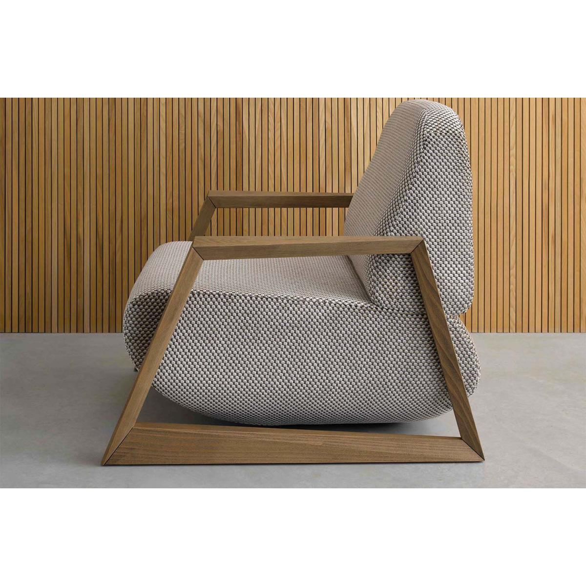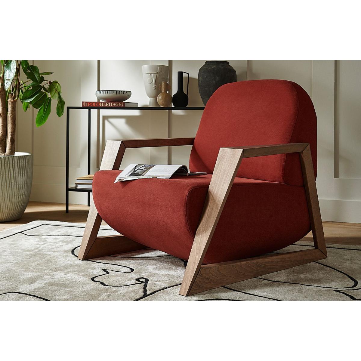 Taking a slice of inspiration from 1980's Danish design, our Hockney armchair is sure to introduce suave style into your home. Bring a touch of the outside in with sleek wooden, angular arms that shape a beautiful juxtaposition with its curved bulbous base. The round foundation elevates the chair from the floor to create a unique, statement piece perfect for any contemporary living space.