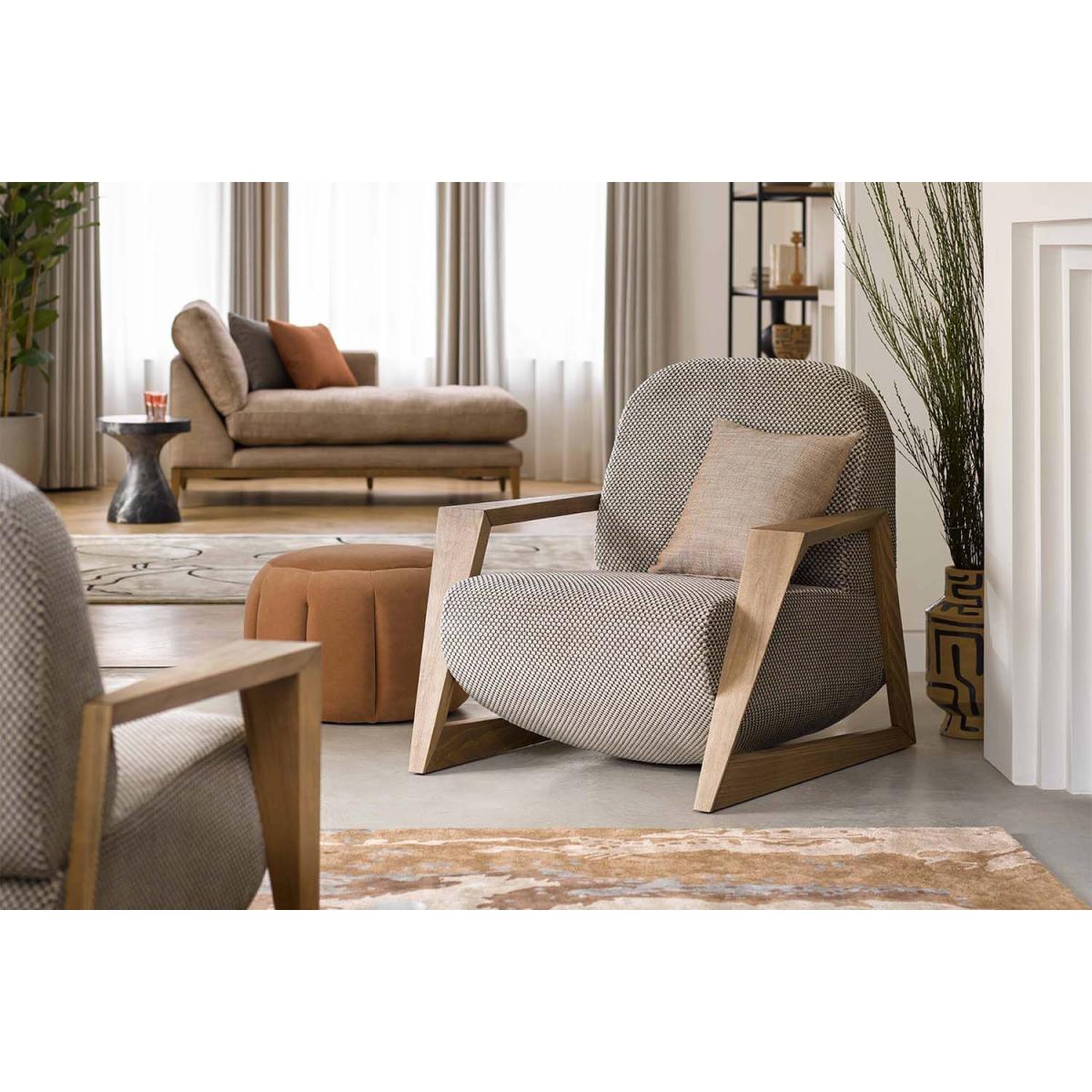 Taking a slice of inspiration from 1980's Danish design, our Hockney armchair is sure to introduce suave style into your home. Bring a touch of the outside in with sleek wooden, angular arms that shape a beautiful juxtaposition with its curved bulbous base. The round foundation elevates the chair from the floor to create a unique, statement piece perfect for any contemporary living space.