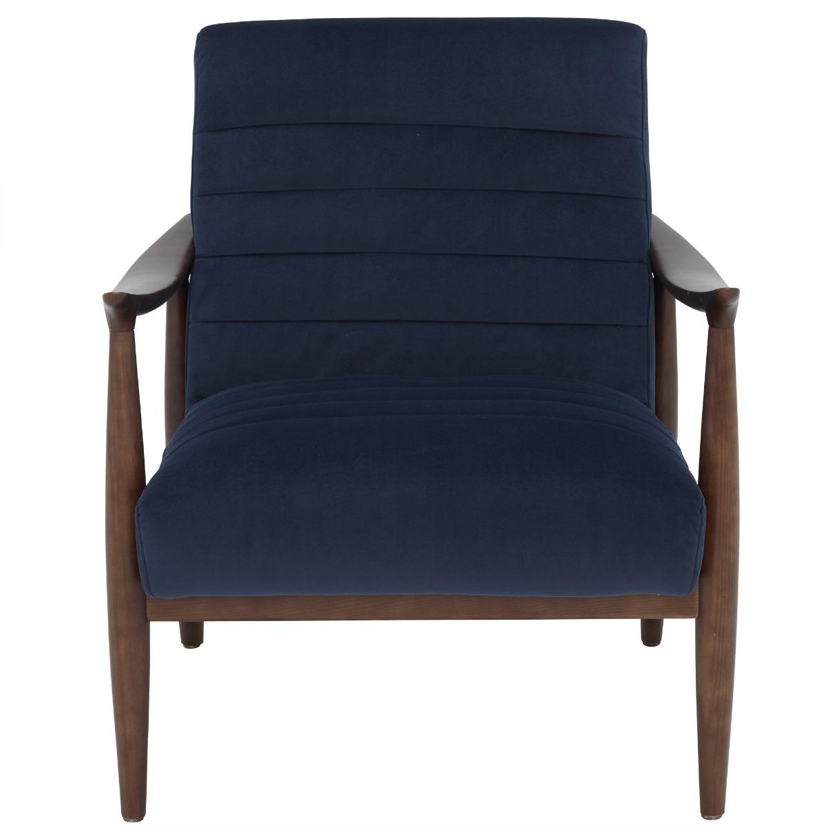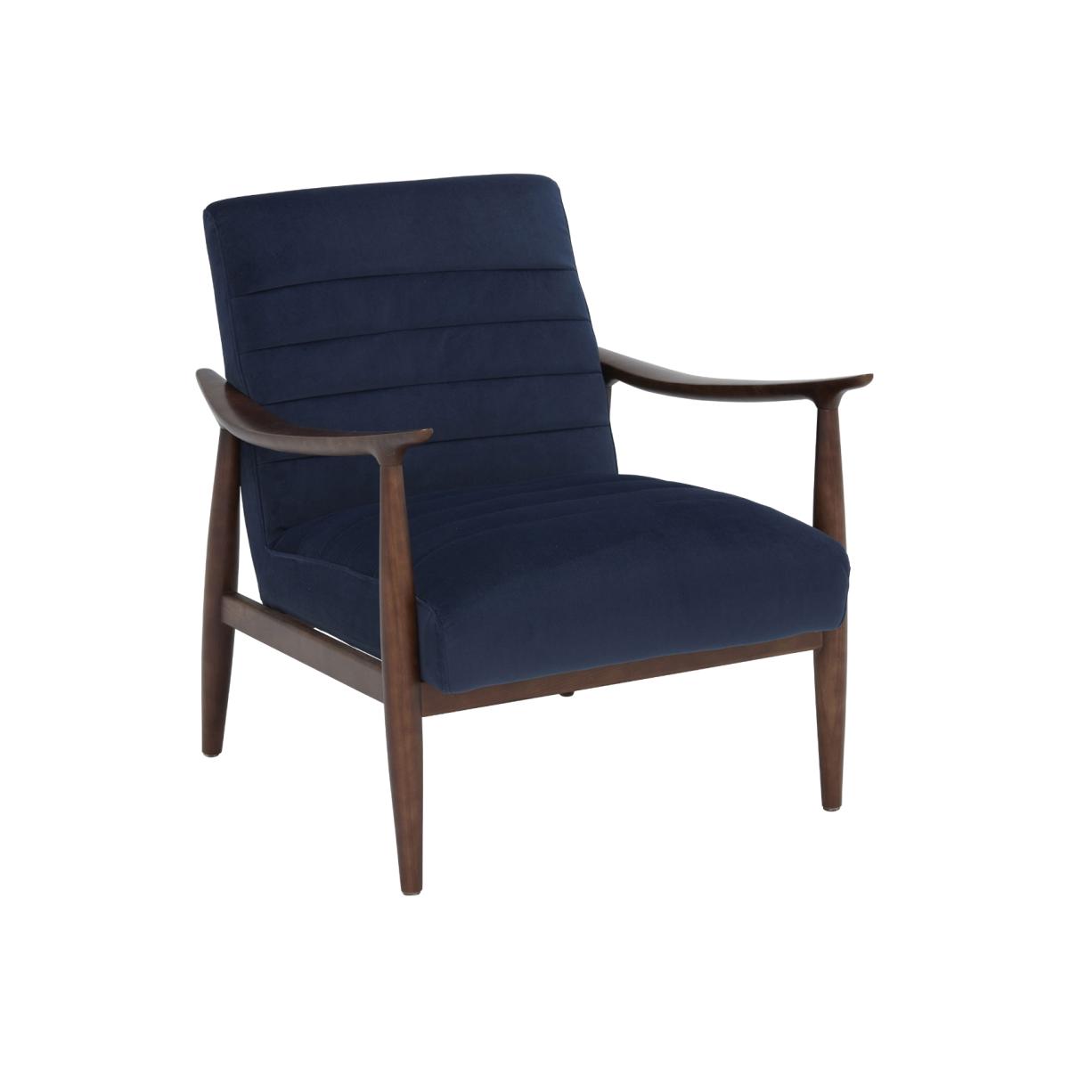 Design. The beautiful Hockney Velvet Armchair,. Blue is the perfect addition to your contemporary living space. Boasting a luxurious charm,. The. Soft. Foam and. Fibre. Seat cushions are wrapped in a sumptuous. Deep. Blue velvet. Detailed with modern horizontal lines and. Complementing the rich, dark wooden arms and feet. Stylish. And super comfortable, take time to sit back and relax whilst reading your favorite book. On. The sublime Ho. Ckney Velvet Armchair.